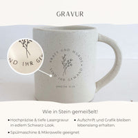 Die schwarze Gravur-Erscheinung wurde nicht durch herkömmliche Druck- oder Beschriftungsverfahren erzielt, sondern dank des Steinmaterials in Kombination mit der tiefen und präzisen Lasergravur. Die warmen Erdtöne und die natürliche Textur machen sie zu einem charmanten Highlight.