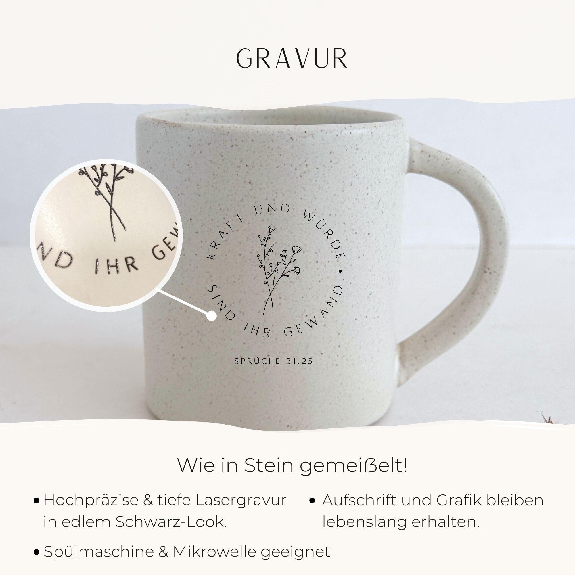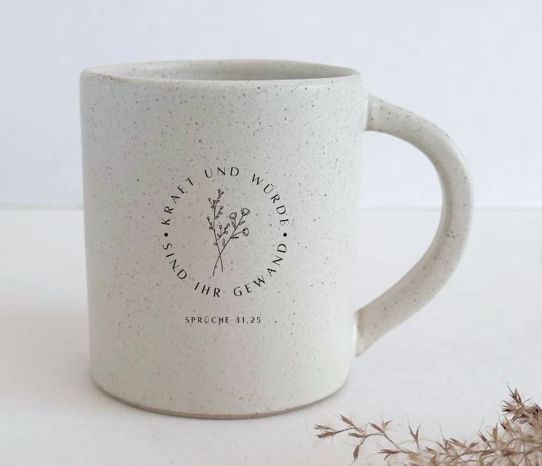 Diese zu 100% handgefertigte Steingut-Tasse mit ihrer reaktiven Sesamglasur und der Gravur "Kraft und Würde sind ihr Gewand" ist mehr als ein Alltagsgegenstand - sie ist eine tägliche Erinnerung an die unendliche Gnade und Liebe Gottes, die uns jeden Morgen aufs Neue begegnet. Perfekt für den Start in den Tag oder eine ruhige Auszeit mit einem heißen Getränk.