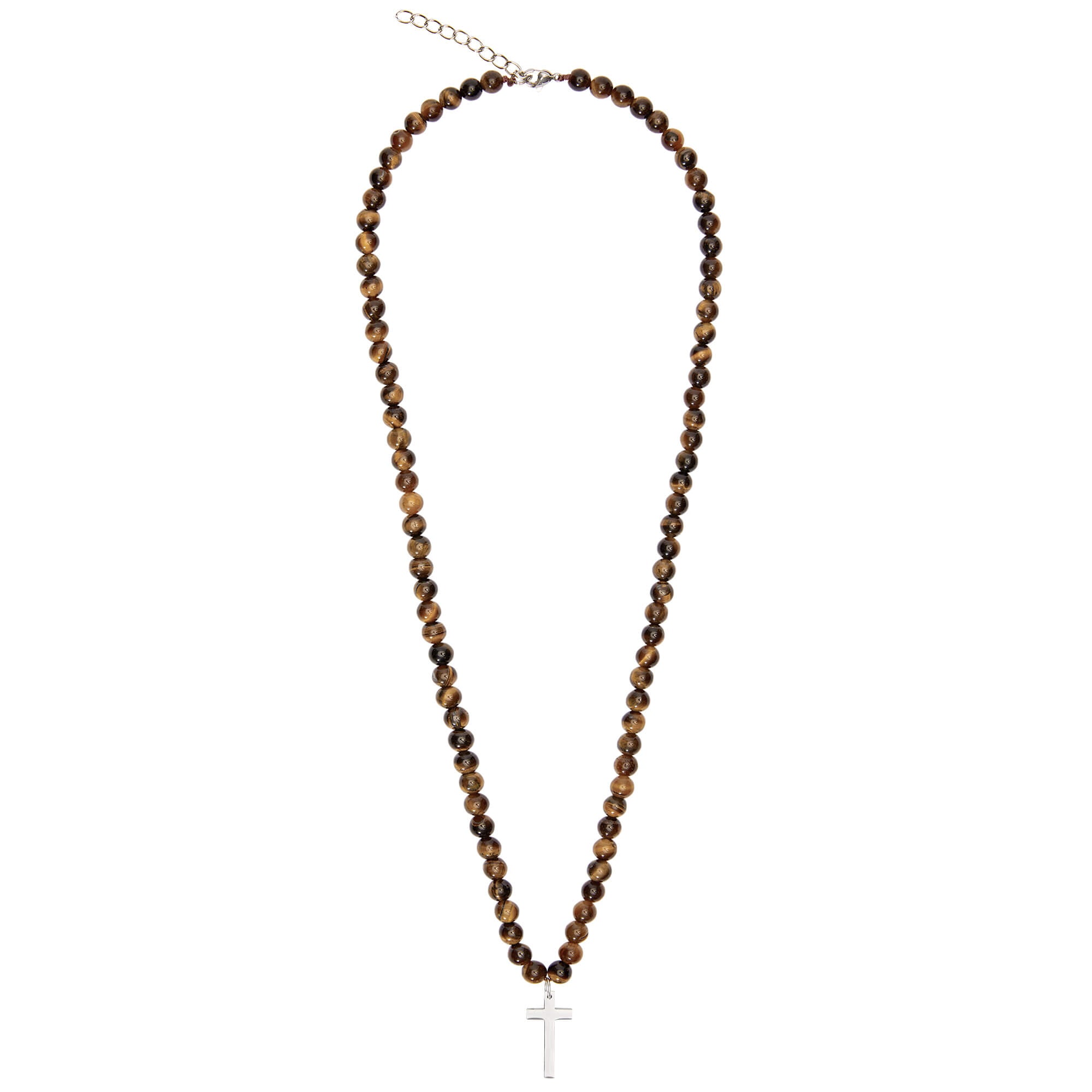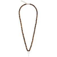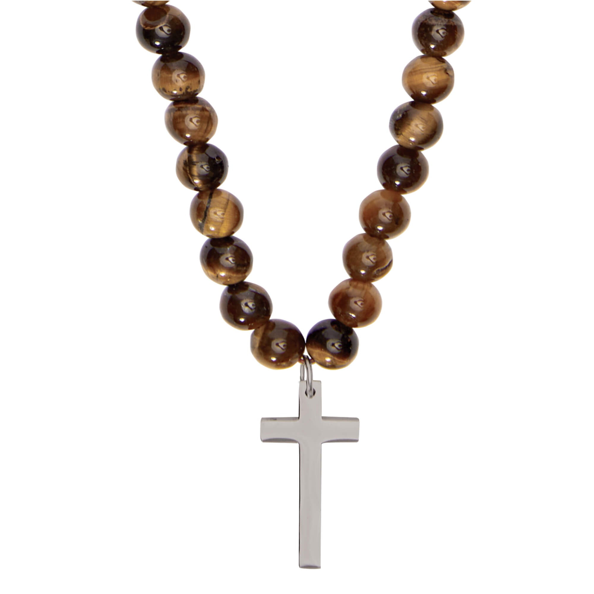 Kreuz - Herren-Halskette mit Edelsteinperlen und Anhänger (Edelstahl versilbert)