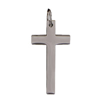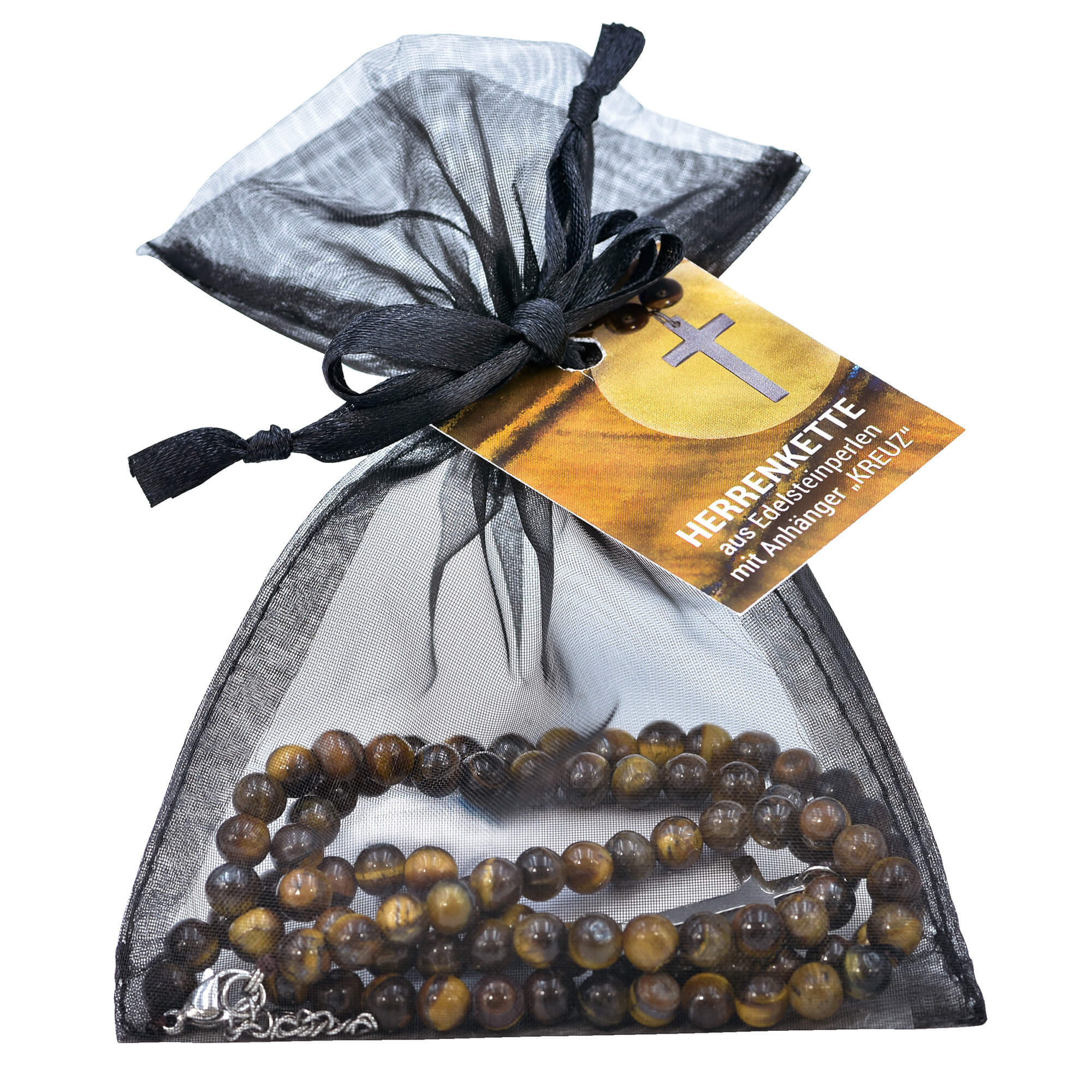 Herren-Halskette aus Edelsteinperlen im modernen Look. Mit Anhänger "Kreuz", aus Edelstahl, fein versilbert.