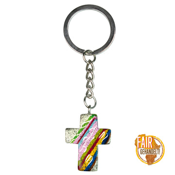 Schlüsselanhänger Kreuz aus Speckstein, bunt, Muster "African Summer", handbemalt, 2,5 x 3 cm
