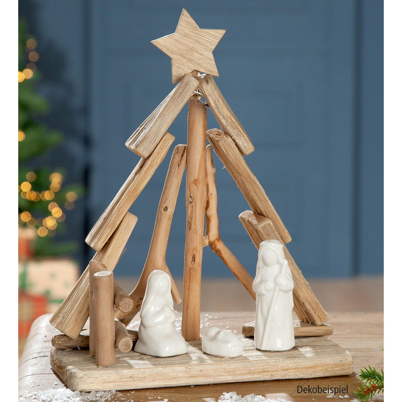 Einfach und ausdrucksstark: Rustikale Krippe aus Treibholz mit Heiliger Familie als weiße Porzellanfiguren.