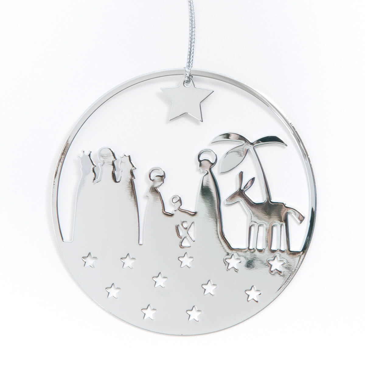 Wunderschöner, edler Hingucker am Weihnachtsbaum oder Tannenzweig: Runder Anhänger aus Metall, glänzend poliert mit Motiv Krippe.