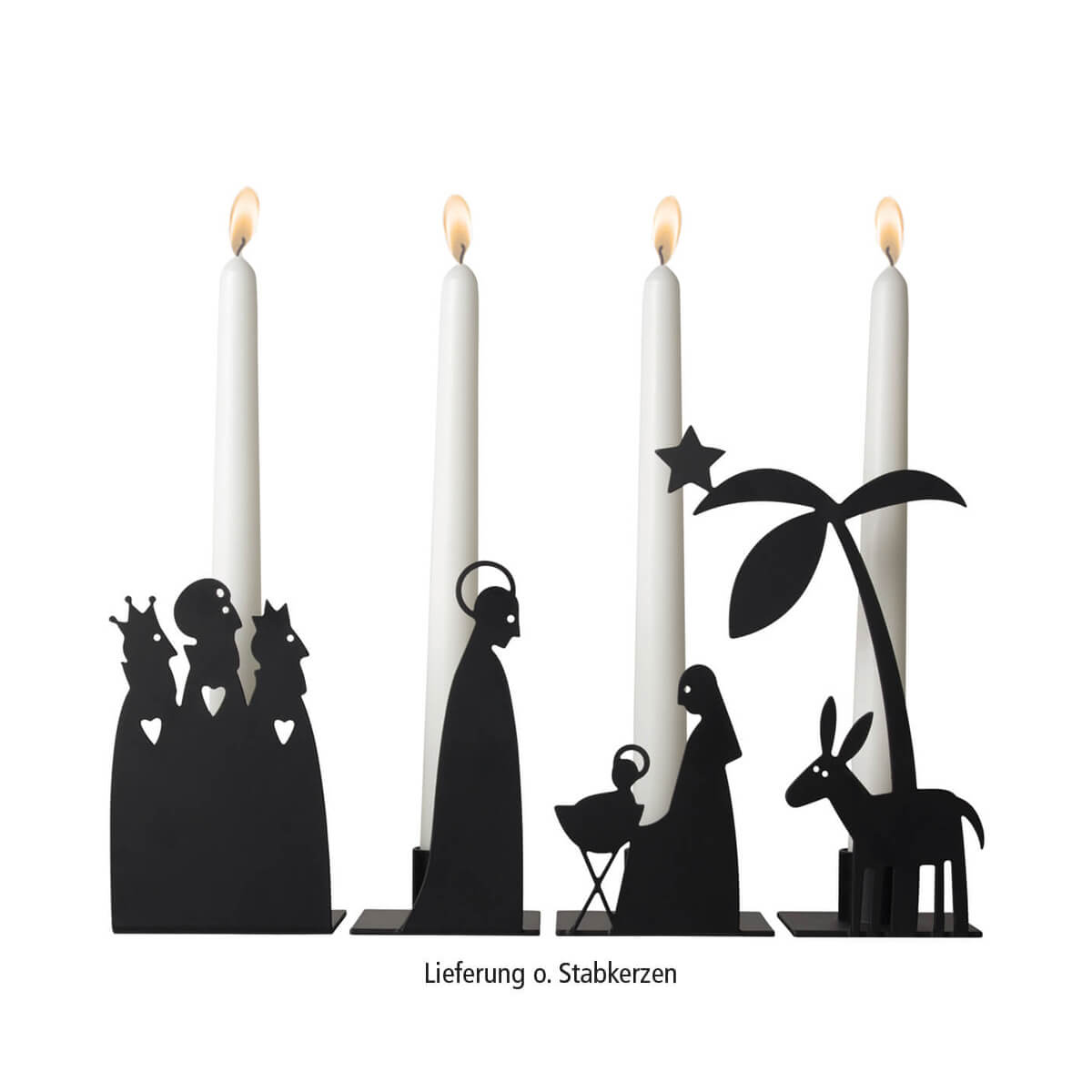Jetzt auch in kleiner Ausführung: Das 4-teilige Kerzenhalter-Set Krippe aus schwarzem matt gearbeiteten Metall ist mit den stimmungsvollen, weihnachtlichen Motiven ein ganz besonderer Blickfang im Haus.