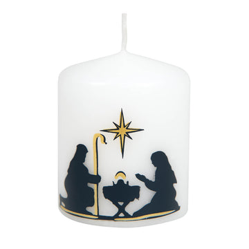 Tischkerze mit moderner Darstellung der weihnachtlichen Krippe.