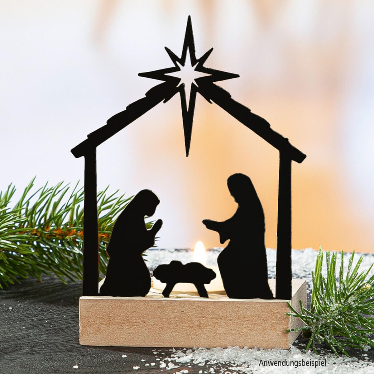 In einem Holzsockel steckt die Krippenszene aus schwarz lackiertem Metall und der Einsatz für ein Teelicht.