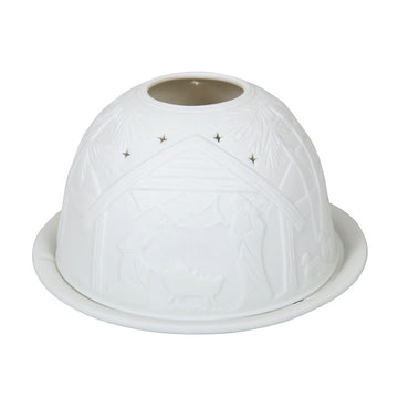 Stimmungsvolles Windlicht in Relief-Design aus matt-weißem Porzellan mit Stern-Aussparungen. Teller mit Halbkugel zaubert eine gemütliche Atmpsphäre.