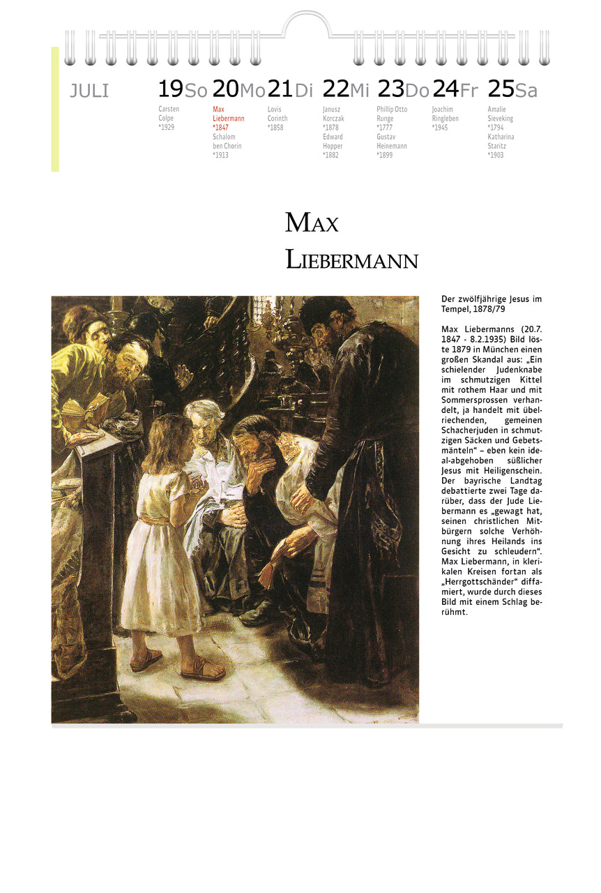Zusätzlich zum passend gewählten Auftaktbild stehen jeweils ein charakteristisches Zitat sowie eine kurze Biographie der vorgestellten Person oder des Kunstwerks. Ein übersichtliches Kalendarium führt die Leserinnen und Leser durch den Kalender, der unter den einzelnen Wochentagen die Namen von Personen, die an diesem Tag Geburtstag haben, bereithält. Der Kalender eignet sich zum persönlichen Entdecken und durch seine durchgehend farbige, ansprechende Gestaltung auch als Geschenk für Freunde oder Kolleginnen, die an Theologie, Kultur und Geistesgeschichte interessiert sind.