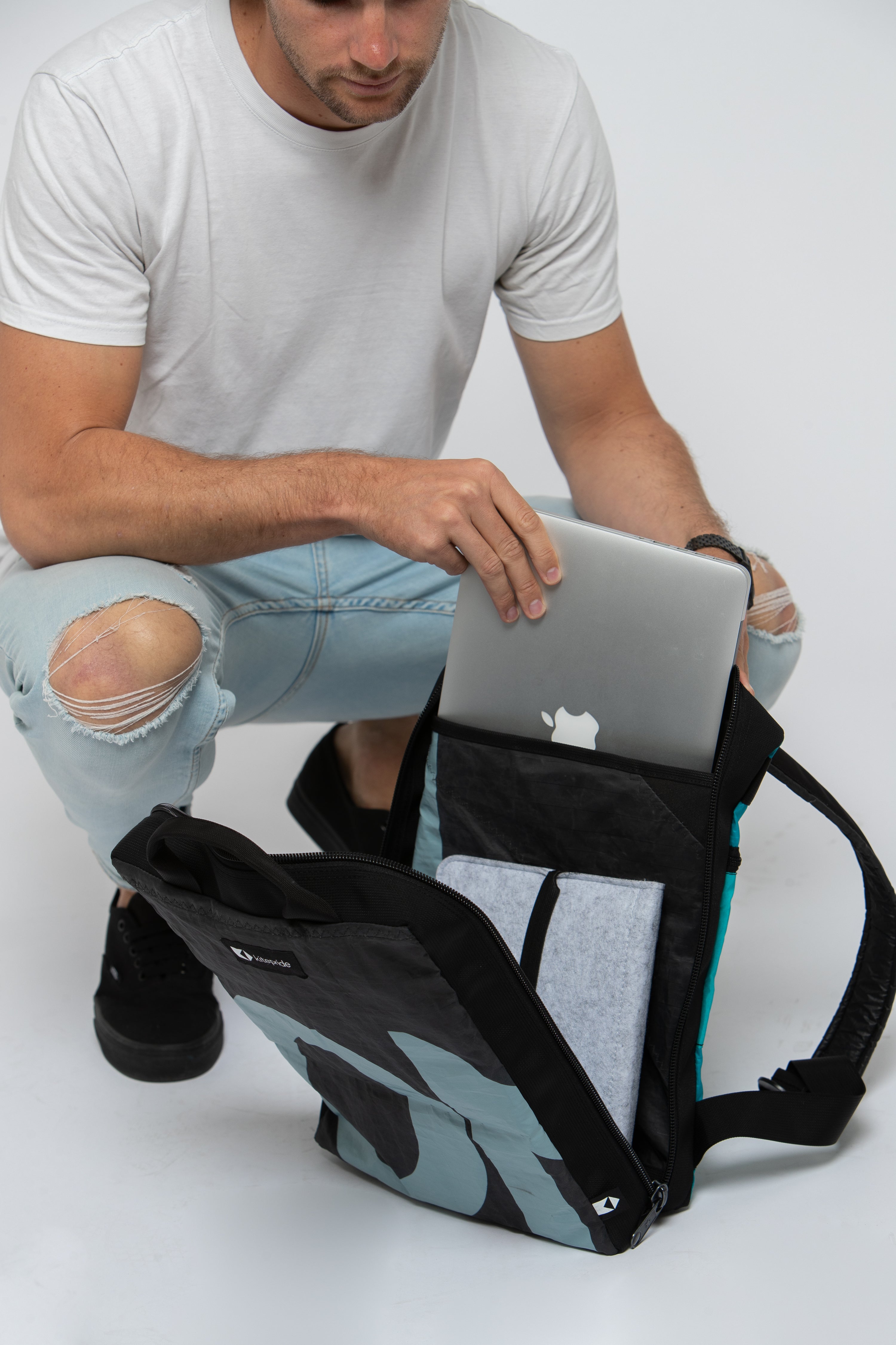 Gibt es sie, die perfekte Tasche für unterwegs, die für alle Gelegenheiten geeignet ist? Egal, ob Geschäftstreffen oder Tagesausflug mit Freunden dieser upgecycelte, wasserdichte Laptop-Rucksack ist genau das Richtige. Mit integrierter Laptop-Innenhülle und einem vollständig zu öffnenden Rucksack kommst du leicht auch an die Dinge wie Schlüssel oder Ladekabel ran, nach denen du sonst immer viel zu lange suchen musst.