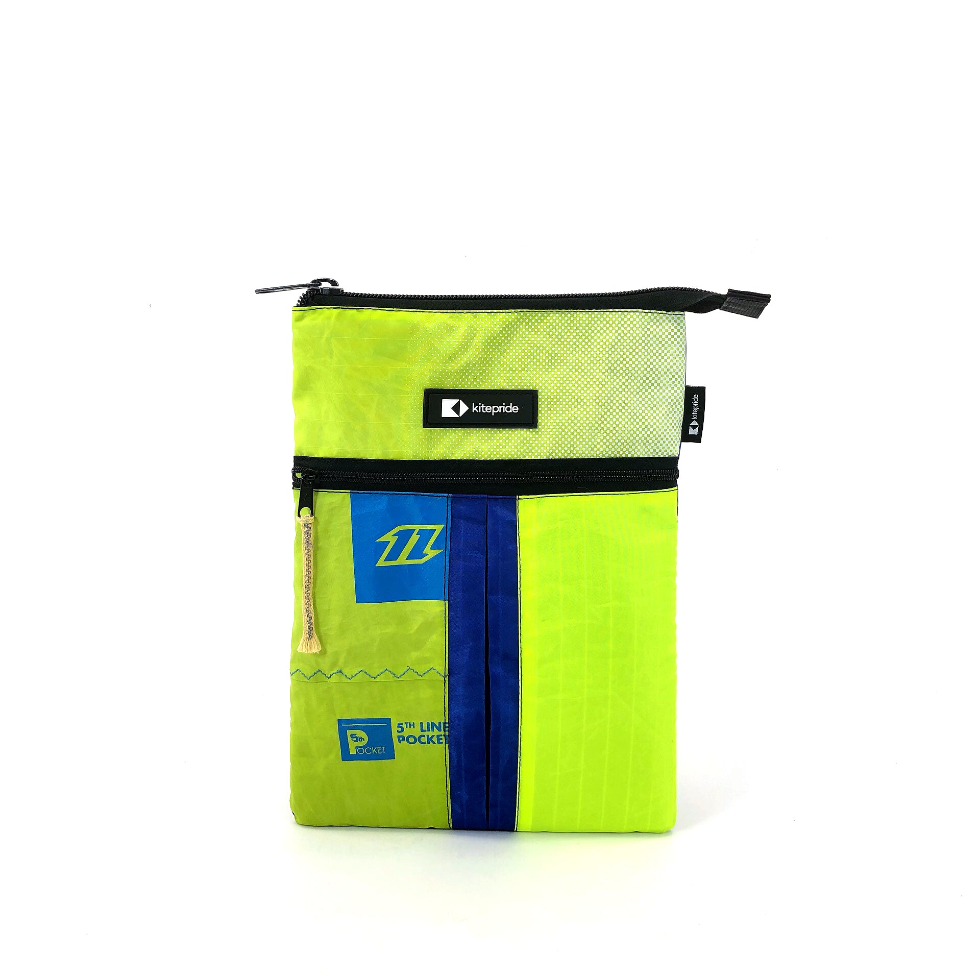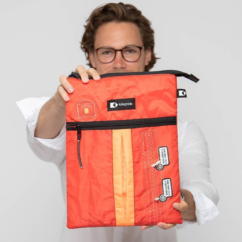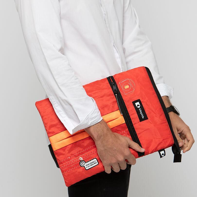Für Remote-Worker und alle, die viel unterwegs sind und alles dabeihaben müssen, ist die upgecycelte Laptophülle aus Kitesurf-Segel genau das Richtige! Laptop, Ladegerät und Telefon - alles findet seinen Platz und wird zum Schutz mit recycelten Neoprenanzügen gepolstert. Die farbenfrohe Außentasche mit Reißverschluss ist optimal zur Aufbewahrung aller kleinen Utensilien.