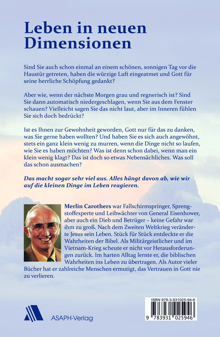 Sind Sie auch schon einmal an einem sonnigen Tag vor die Haustür getreten, haben die würzige Luft tief eingeatmet und Gott für seine herrliche Schöpfung gedankt? Aber was, wenn dann der nächste Morgen grau und regnerisch ist? Unser Verhalten in den kleinen Dingen des Lebens hat grosse Auswirkungen. Wollen Sie es einmal auf eine ungewohnte Art und Weise versuchen, schwierige Situationen mit Lob und Dank zu meistern?