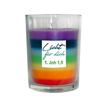 Im ganzen Raum verbreitet die Regenbogenkerze einen feinen Vanilleduft, wenn sie entzündet wird. Diese Duftkerze ist auch optisch ein farbenfrohes Highlight: Die einzelnen Wachsschichten sind in freundliche, helle Farben unterteilt. Auf dem Kerzenglas ist der Vers "Licht für dich 1. Joh 1,5" auf der rechteckig bedruckten Fläche ausgespart und kommt damit besonders gut zur Geltung.