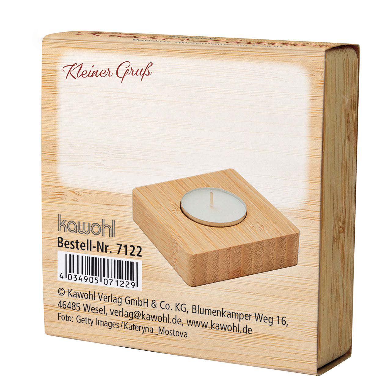 Teelichthalter aus Bambus mit Teelicht in einer gestalteten Banderole mit Widmungsmöglichkeit