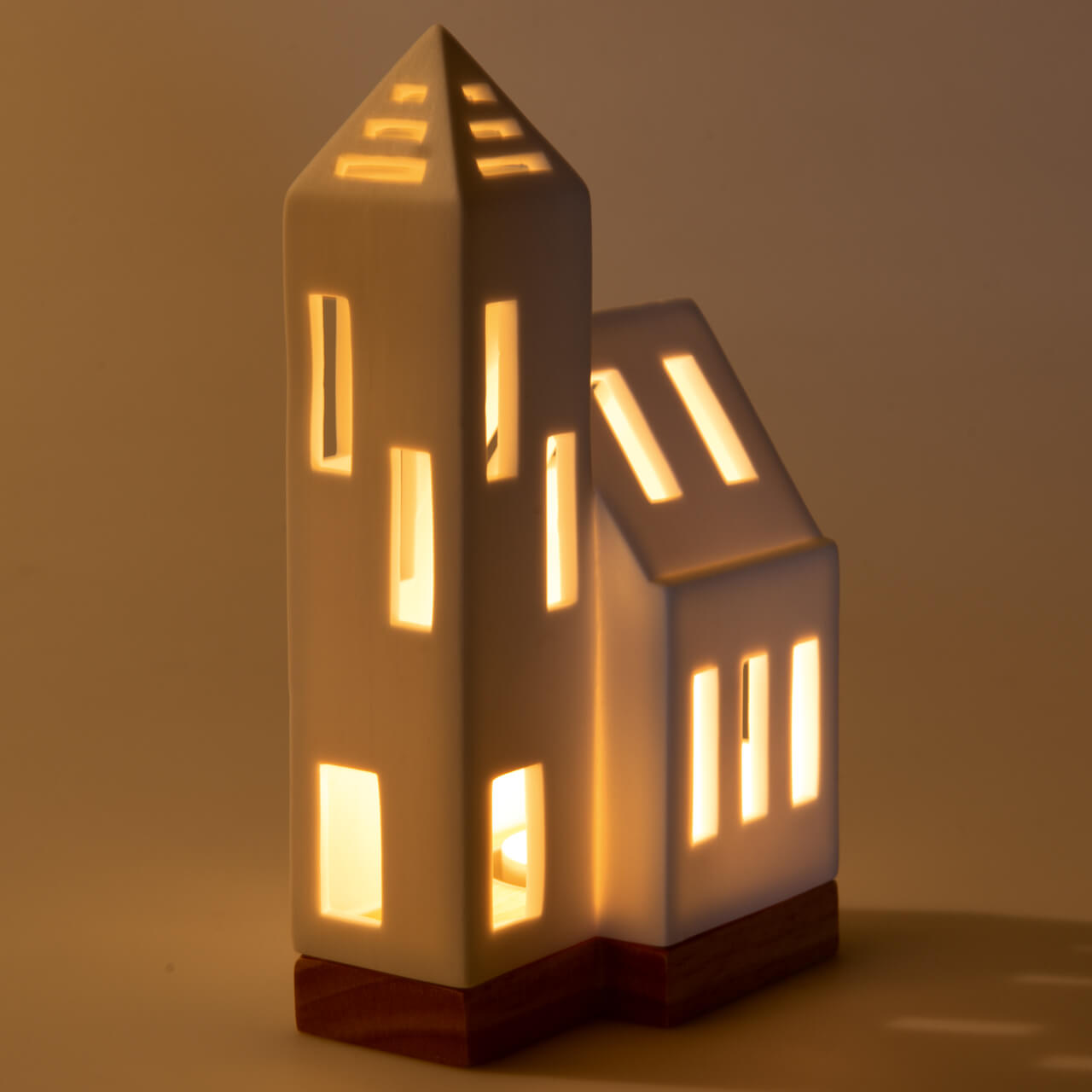 Das Lichthaus in Form einer Kirche strahlt Geborgenheit und Wärme durch viele Fensteröffnungen aus, wenn im Inneren ein Teelicht (alternativ LED-Teelicht) angezündet wird.
