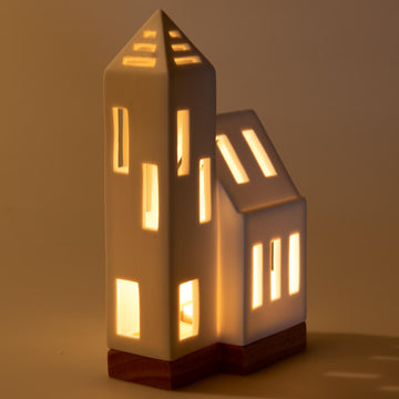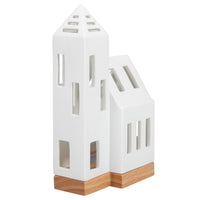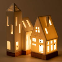 Das Lichthaus ist aus weißem Porzellan mit unglasierter Oberfläche gefertigt und wird mit einem Holzsockel inkl. Einsatz für ein Teelicht geliefert. Lieferung in Einzelverpackung ohne Teelicht.