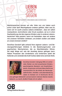 Machtmenschen kennen wir alle. Viele von uns haben auch schon unter dem Machtgebaren anderer gelitten. Aber was ist, wenn wir im Laufe unseres Lebens entdecken , dass wir selbst manipulieren, kontrollieren oder Druck ausüben, sei es in einer Paarbeziehung, bei den eigenen Kindern oder in anderen Lebensbereichen? Was passiert, wenn wir feststellen, dass wir andere mit unserem Verhalten verletzen, uns ändern wollen und dabei an unsere Grenzen stoßen? Dorothea Gersdorf gibt anhand ihrer eigenen Lebens- und Beratungserfahrungen Einblick in die Beziehungsmuster und psychischen Mechanismen, die zu Machtkämpfen führen. Sie zeigt Wege auf, wie der Ausstieg daraus gelingen kann. Neben Prozessen des Umdenkens und Umlernens spielt die heilende und verändernde Kraft Gottes dabei eine zentrale Rolle.