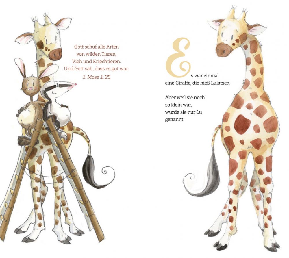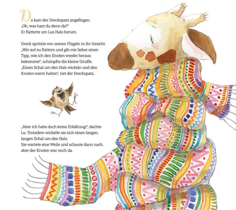 Als Lu aufwacht, erschrickt sie fürchterlich: Sie hat einen Knoten im Hals! Der Dreckspatz, der Angsthase und der Frechdachs wollen ihr helfen, den Knoten zu entfernen. Aber es klappt nicht. Als schließlich Mama Giraffe mit dem Frühstück nach Hause kommt, löst sie nicht nur das Knotenproblem. Sie hilft Lu auch, zu verstehen, warum Gott jeden ihrer Freunde ganz anders gemacht hat - und warum Giraffen unbedingt einen langen Hals brauchen.