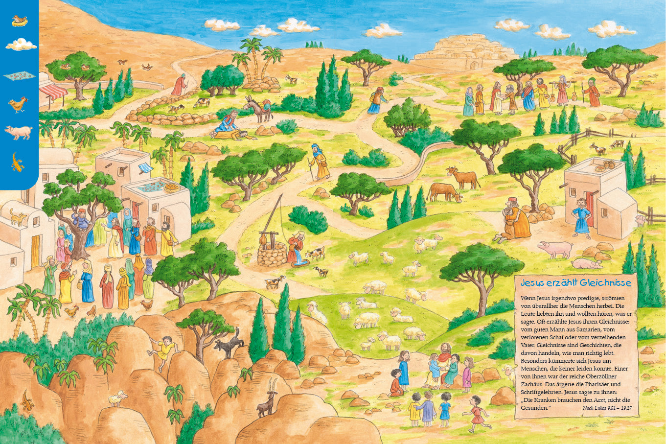 Dieses großformatige Pappbilderbuch wird den Forscherdrang in Ihren Kleinen entfesseln! Die ebenso lustigen wie detailreichen Darstellungen des biblischen Geschehens laden dazu ein, tief in die Welt der biblischen Geschichten einzutauchen. Auf je einer Doppelseite werden zentrale Geschichten des Neuen Testaments dargestellt. An den Bildrändern finden sich jeweils die Personen, Tiere und Dinge, die im Bild zu suchen sind. Außerdem gibt es auf jeder Doppelseite eine Nacherzählung der biblischen Geschichte. So lernen ihre Kleinen spielend leicht die Bibel immer besser kennen.