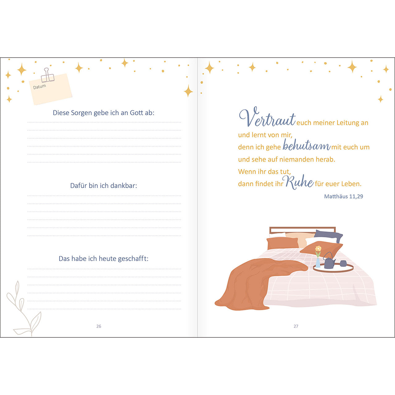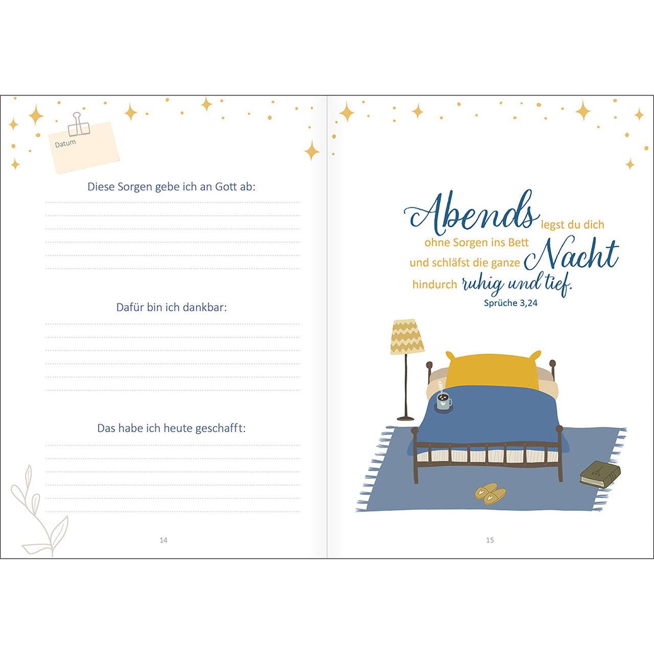 11 Wochen lang lädt Sie der liebevoll gestaltete Begleiter Abend für Abend ein, ihm alles anzuvertrauen, was Sie den Tag über beschäftigt hat. Wöchentliche Impulse geben Ihnen wertvolle Tipps, wie Sie besser schlafen können und stärken Ihr Gottvertrauen. 7 Tage lang helfen Ihnen Stichworte, Gedanken zu ordnen und mit wenig Aufwand zu notieren.