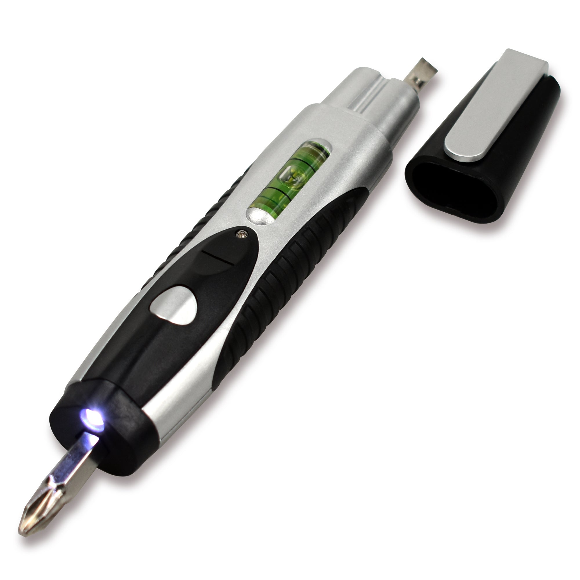 mit Kreuz- und Schraubendreher-Bit, Wasserwaage und LED-Licht