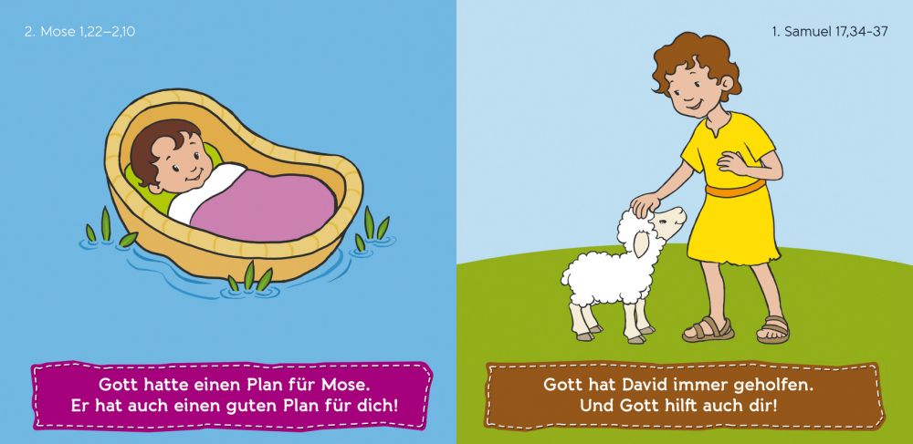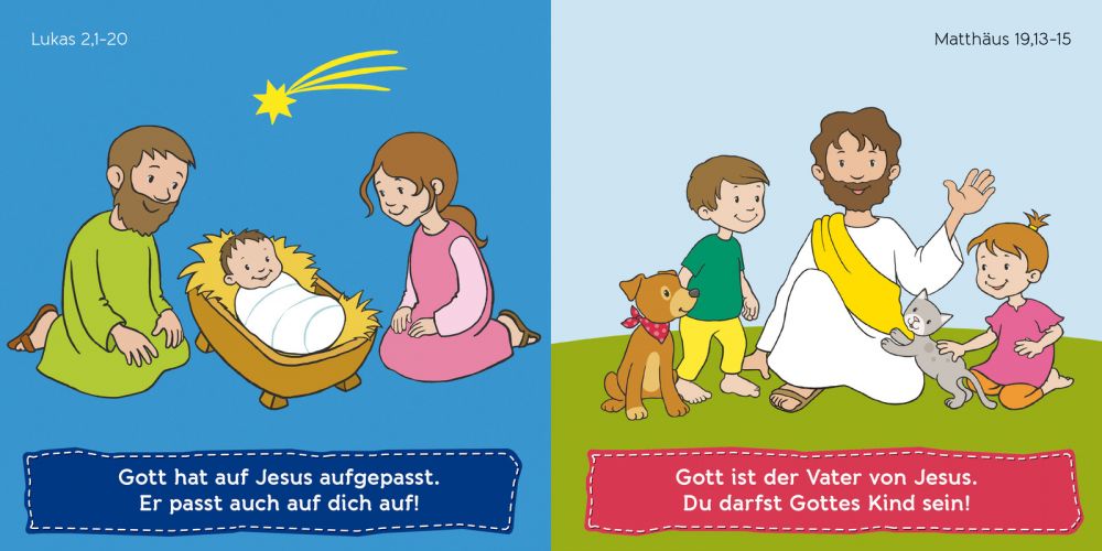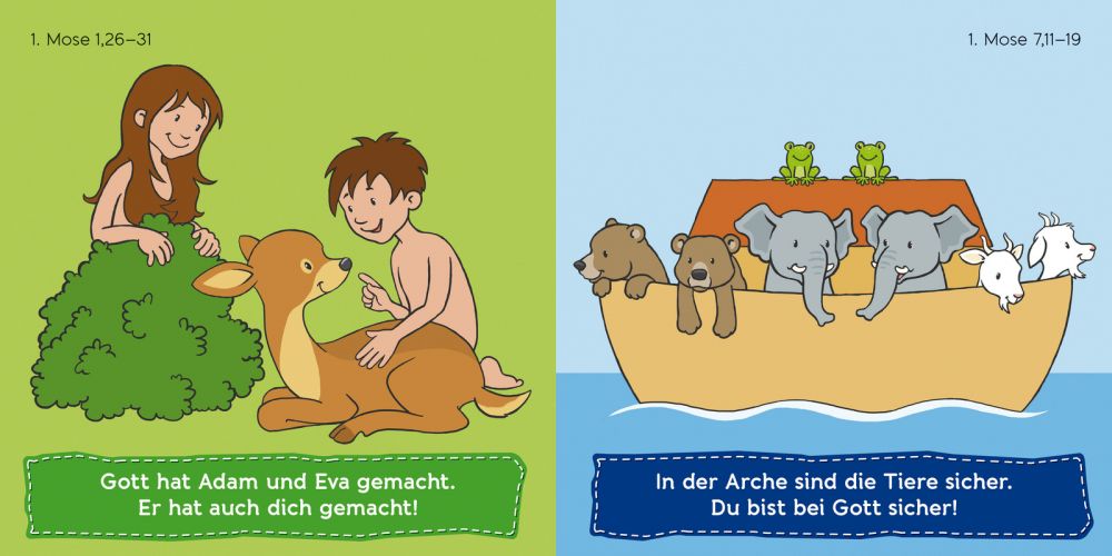 Schon Babys wollen Bücher entdecken: knautschen, fühlen, hören, betrachten und in den Mund stecken. Wie gut, wenn auch eine Kinderbibel diese ganzen Möglichkeiten bietet! Die erste und letzte Seite knistern, die Materialien sind auf Babyfreundlichkeit getestet. Und wenn das Buch ausgiebig vom kleinen Leser erprobt wurde, können Eltern die biblische Geschichte zu den Bildern erzählen oder vorlesen.