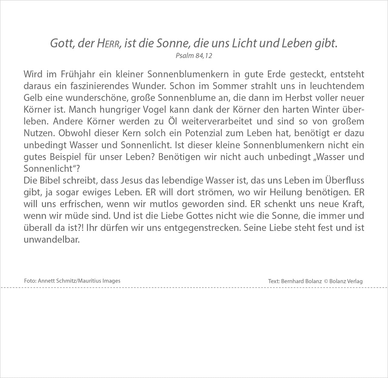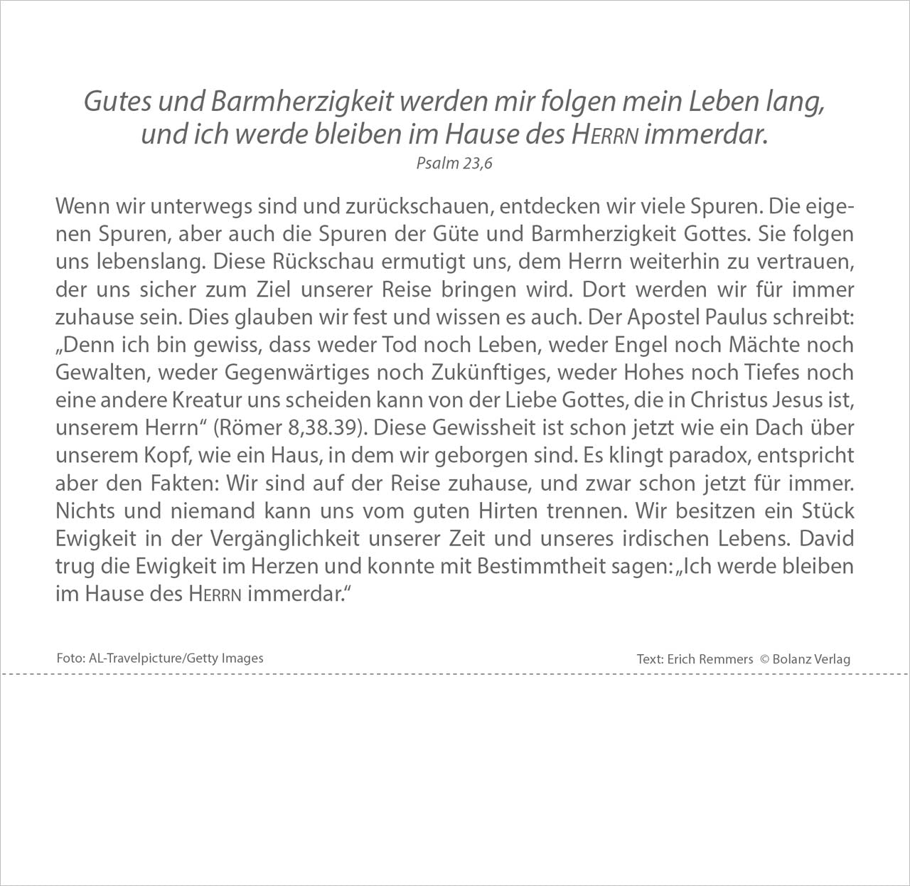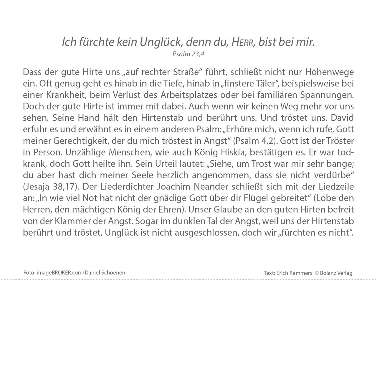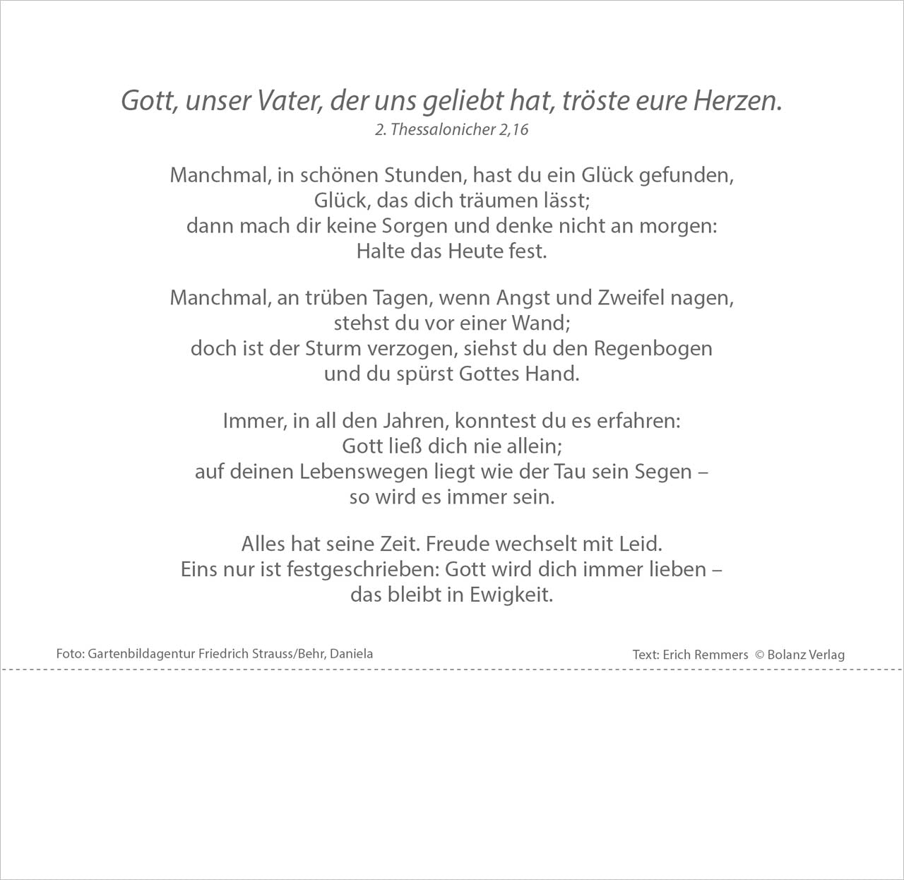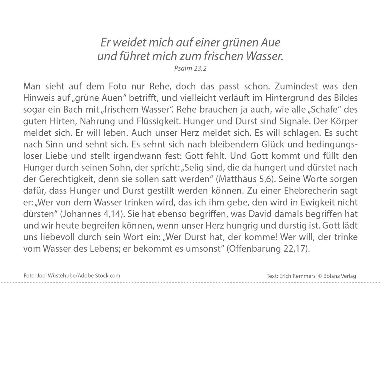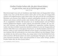 Ausdrucksstarke Fotografien und Bibeltexte voller Hoffnung lassen uns Zeit finden, um einmal innezuhalten im Stress des Alltags. Lassen Sie sich nicht ständig antreiben und durchs Leben jagen. Kommen Sie häufiger zur Ruhe. Einfühlsame Texte von Erich Remmers auf den Rückseiten unterstreichen den besinnlichen Charakter dieses Tischkalenders.