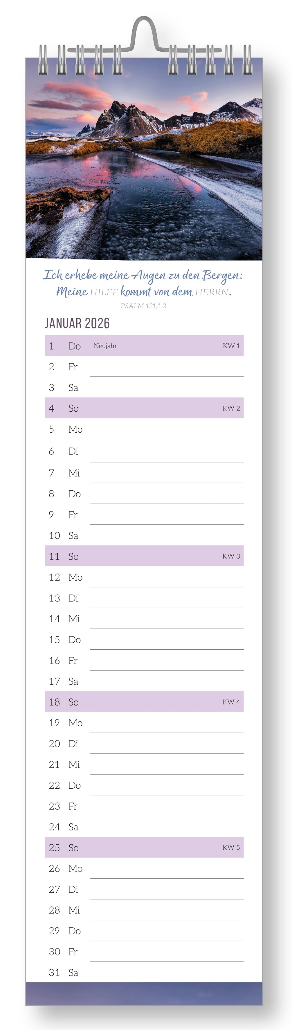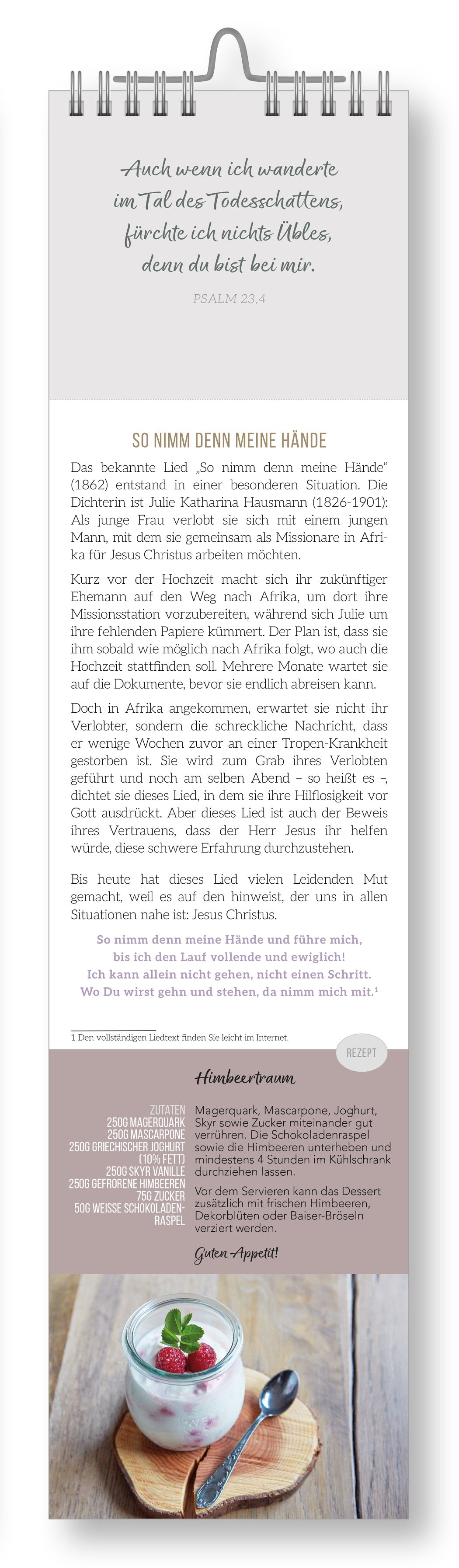 Schöne Fotos und Bibelverse laden dazu ein, Termine übersichtlich festzuhalten. Auf den Rückseiten machen ausgewählte Andachtstexte Mut, im Vertrauen auf Jesus Christus Geborgenheit und Erfüllung im Leben zu finden. Zusätzlich gibt es abwechselnd Lesetipps und gesunde Rezepte. Auf einer Zusatzseite wird die Botschaft der Bibel prägnant zusammengefasst. Dieser Kalender eignet sich besonders zur Weitergabe an Menschen, die kein tägliches Andachtsbuch lesen.