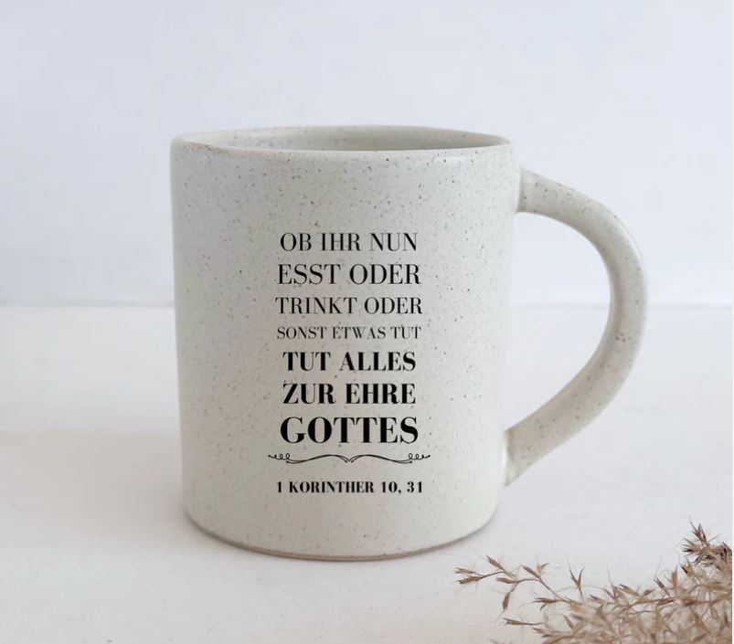 Diese liebevoll handgefertigte Steingut-Tasse mit ihrer reaktiven Sesamglasur und der Gravur "Ob ihr nun esst oder trinkt oder sonst etwas tut - tut alles zur Ehre Gottes!" (1. Korinther 10,31) ist mehr als nur Geschirr. Sie dient als tägliche Erinnerung, das Leben mit Dankbarkeit und Hingabe zu leben - perfekt für den Start in den Tag oder eine ruhige Auszeit mit einem heißen Getränk.