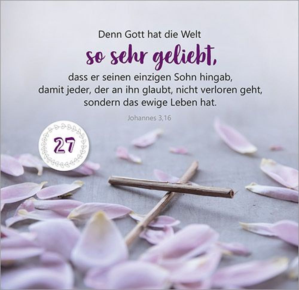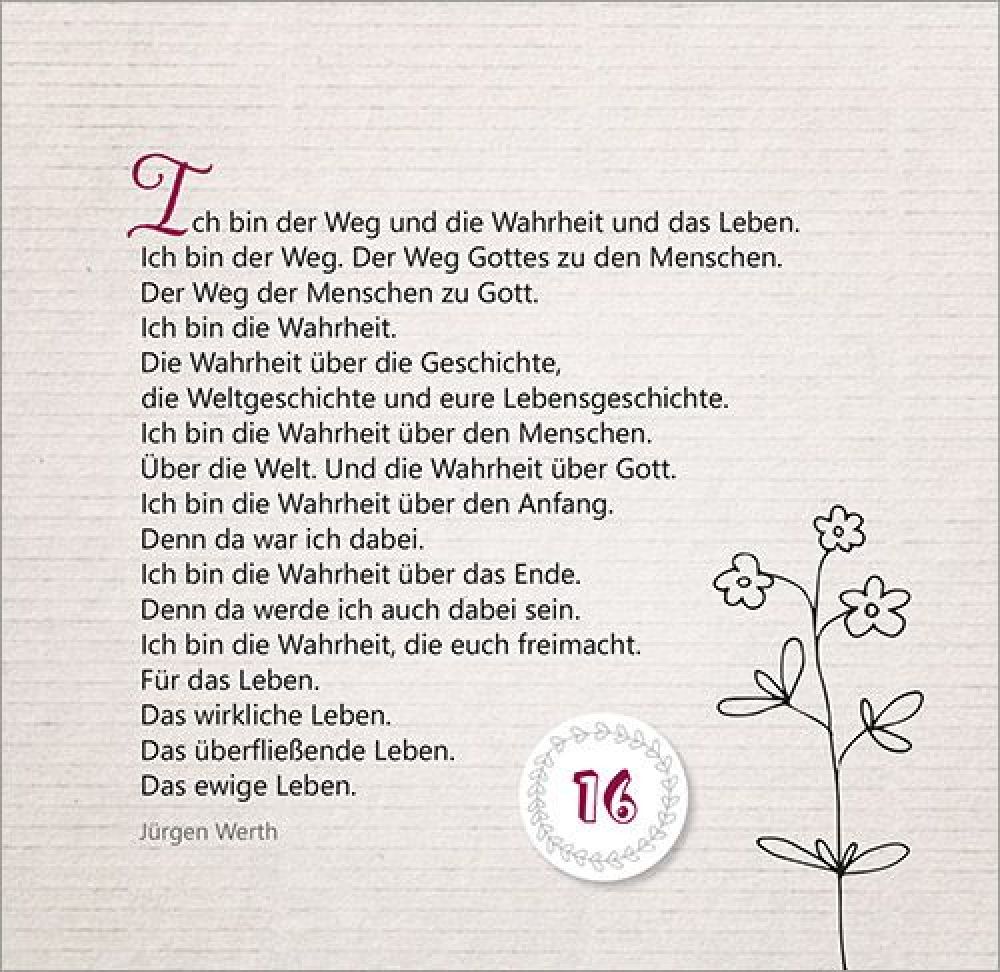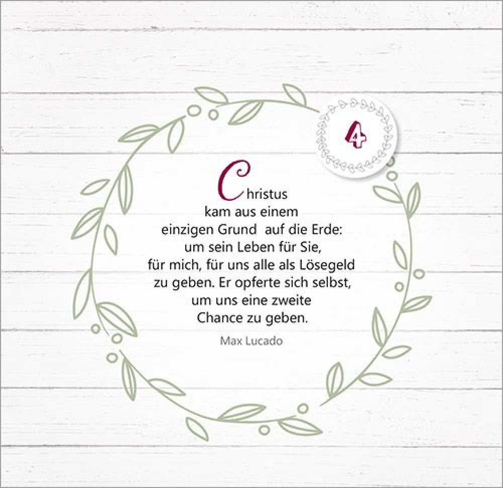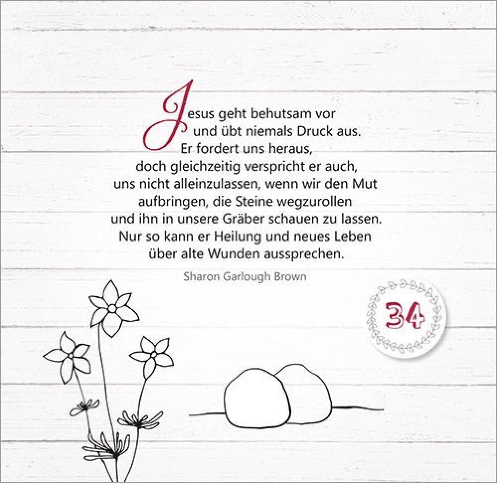 47. Tag bis 52. Tag: Der Herr ist auferstanden! Von der OsterfreudeMit Texten und Zitaten von Max Lucado, John Ortberg, Jürgen Werth, Sharon Garlough Brown, Andi Weiss, Francine Rivers, Hans-Joachim Eckstein, Thomas Joussen, Martin Luther, Paul Gerhardt und anderen.