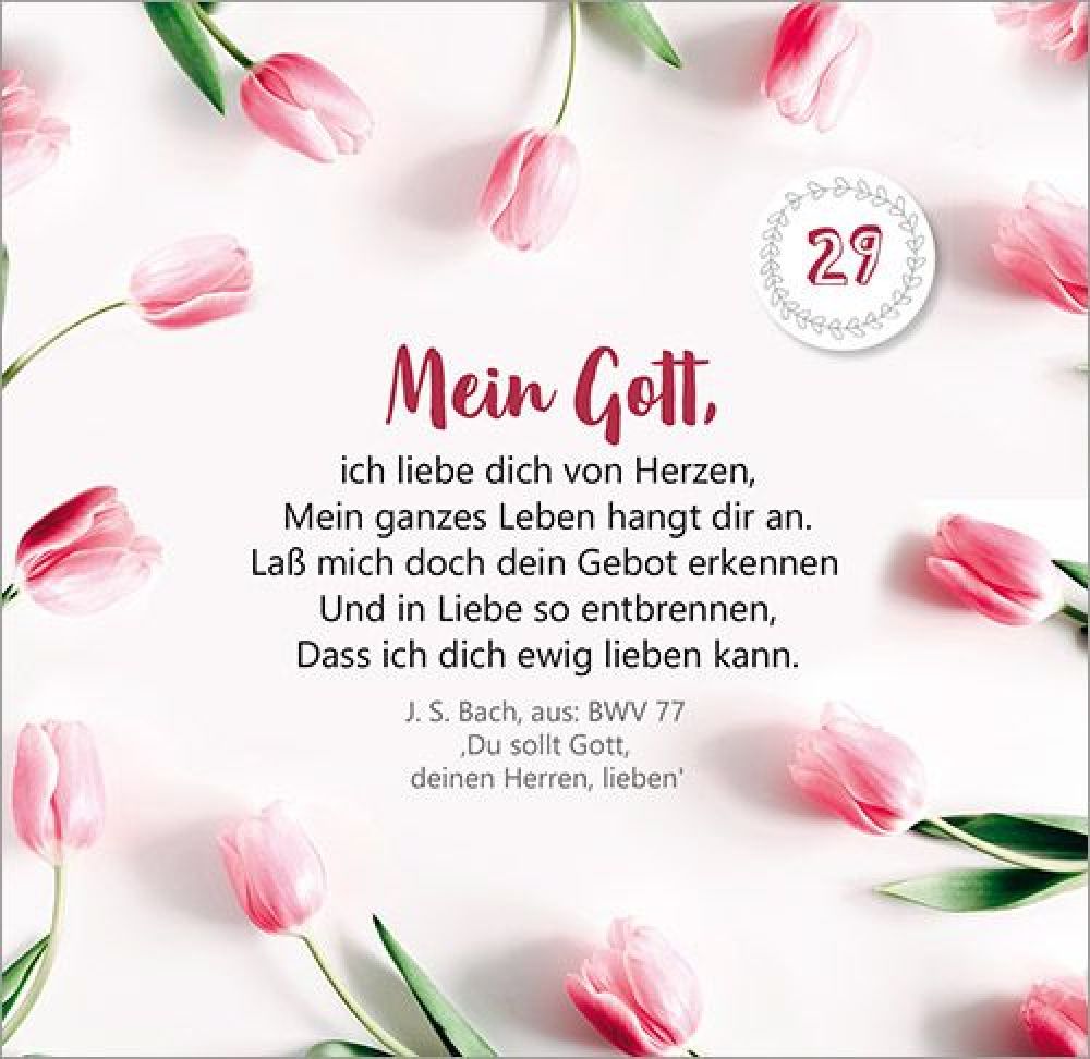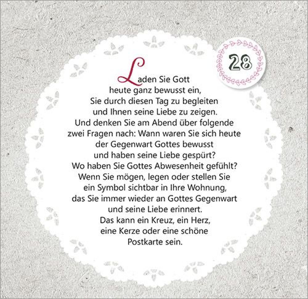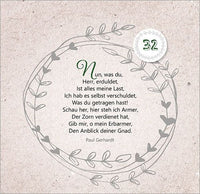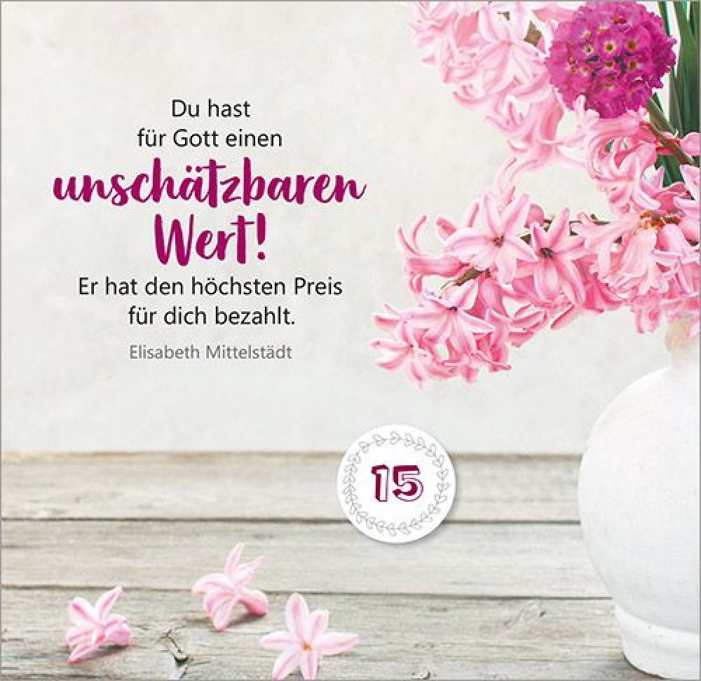 47. Tag bis 52. Tag: Der Herr ist auferstanden! Von der OsterfreudeMit Texten und Zitaten von Max Lucado, John Ortberg, Jürgen Werth, Sharon Garlough Brown, Andi Weiss, Francine Rivers, Hans-Joachim Eckstein, Thomas Joussen, Martin Luther, Paul Gerhardt und anderen.