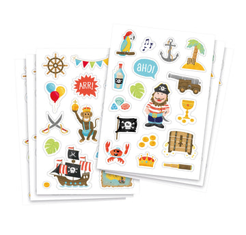 Auf ins Abenteuer! Die lustigen Sticker mit bärtigen Piraten, sprechenden Papageien und wertvollen Schätzen zeigen eine bunt illustrierte Welt und machen einfach Freude - als Geschenk, für Kindergeburtstage oder einfach so. Das Set besteht aus 2 verschiedenen Designs, jeweils 3 Bögen, insgesamt 108 Sticker.