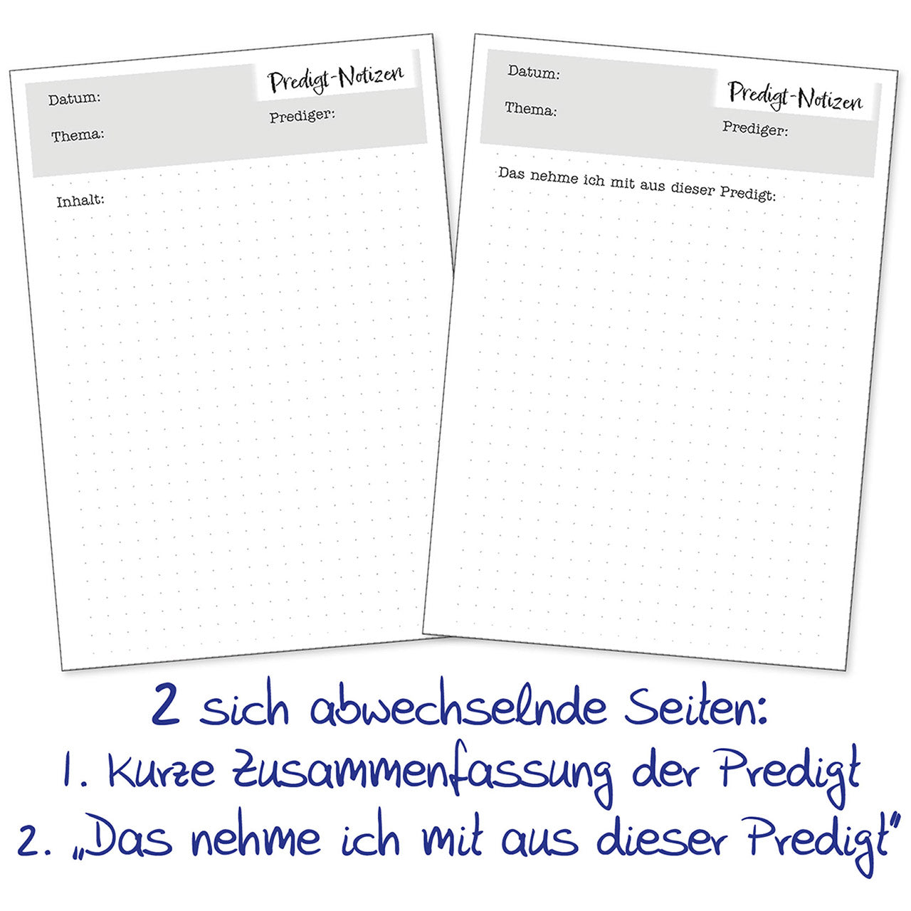 Wertvolle Impulse aus Predigten sind im Alltag oft schnell vergessen. Ein guter Grund, sie in diesem Eintragheft zu notieren. Strukturierte Stichpunkte helfen, Kostbarkeiten zu bewahren.
