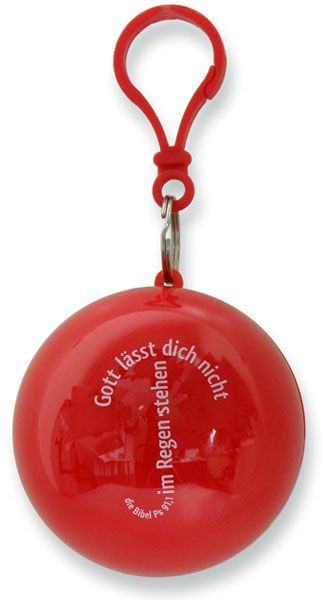 Ein originelles Geschenk: roter Regenponcho mit Kapuze, verpackt in einer Kugel (7cm) mit Karabiner zum Umhängen, Textaufdruck: "Gott lässt dich nicht im Regen stehen"