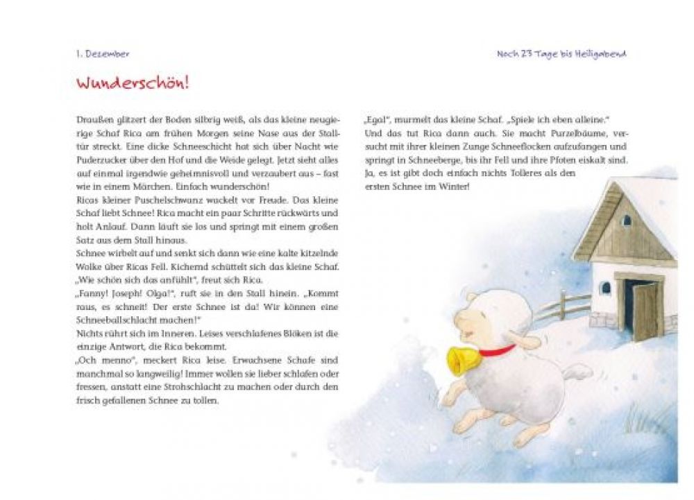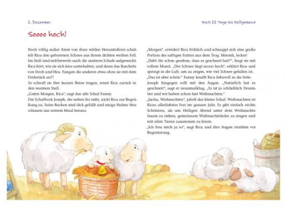 - Eine Geschichte für Kleinkinder: In diesem Weihnachtskalender wird eine weitere Geschichte um das Schäfchen Rica und ihre Tier-Freunde kindgerecht in 24 Kapiteln erzählt