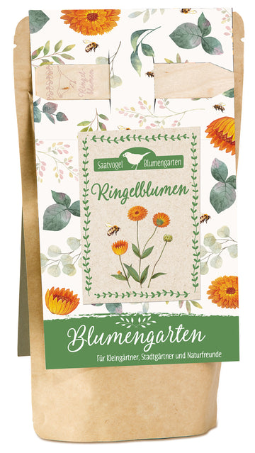 Blumengarten-Pflanzset bestehend aus: 0,280 kg Erde in wasserfester Papiertüte (13 x 21,5 cm), 0,001 kg hochwertigem Saatgut und Holz-Pflanzstäbchen