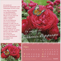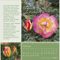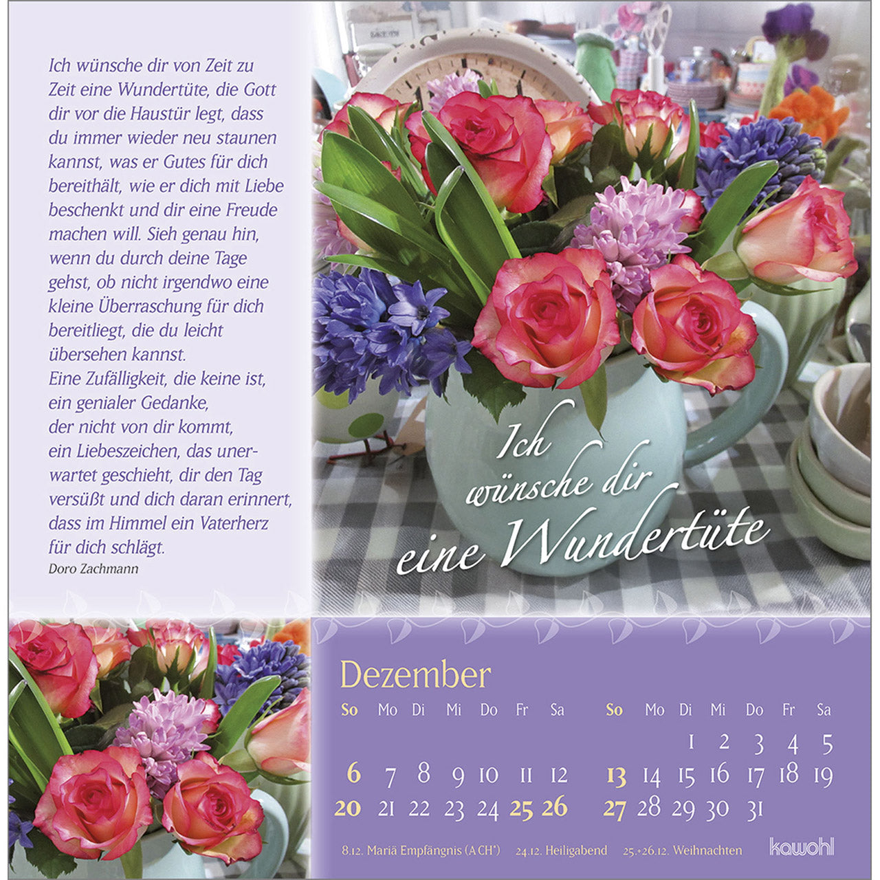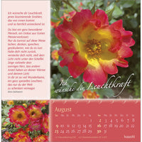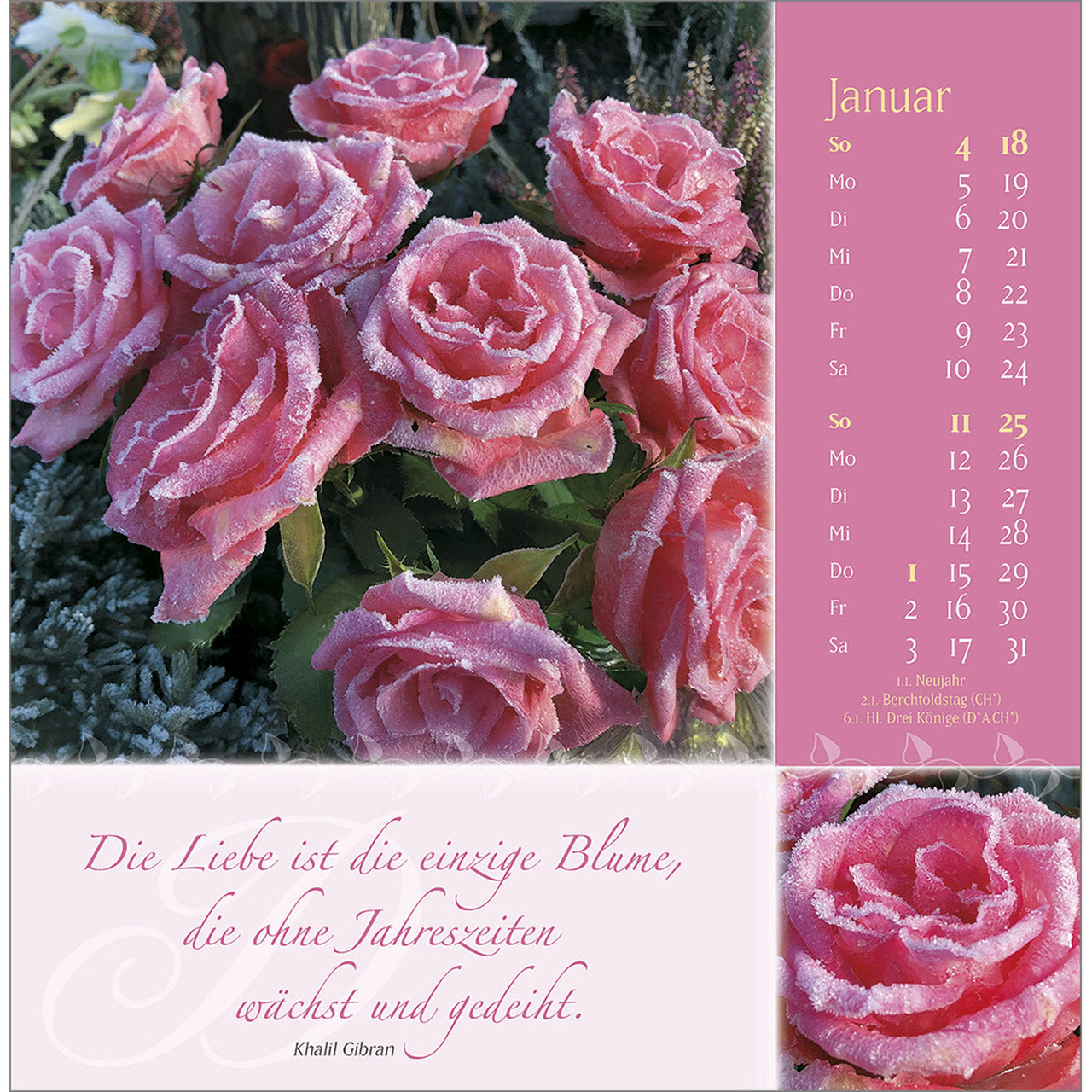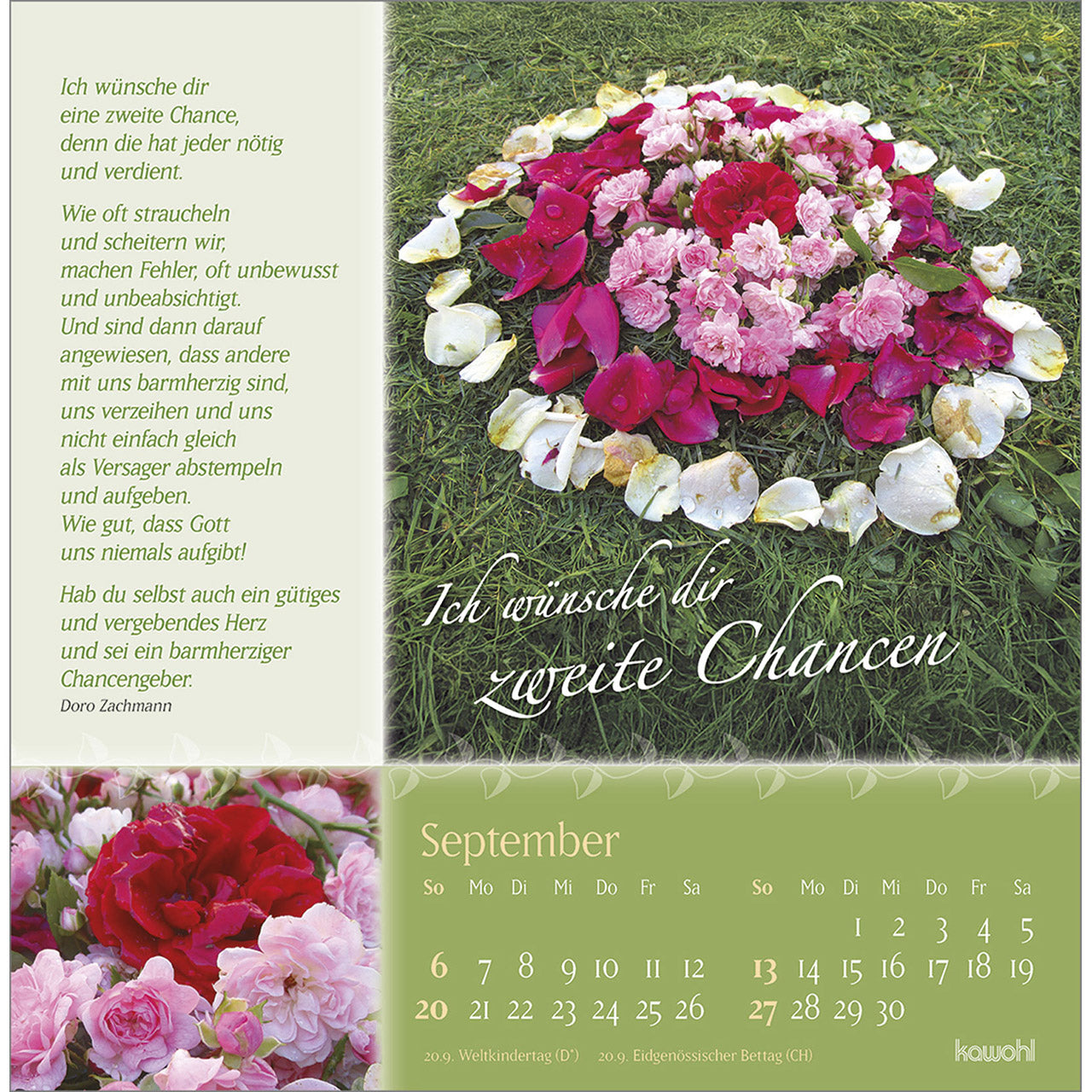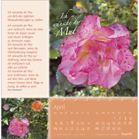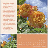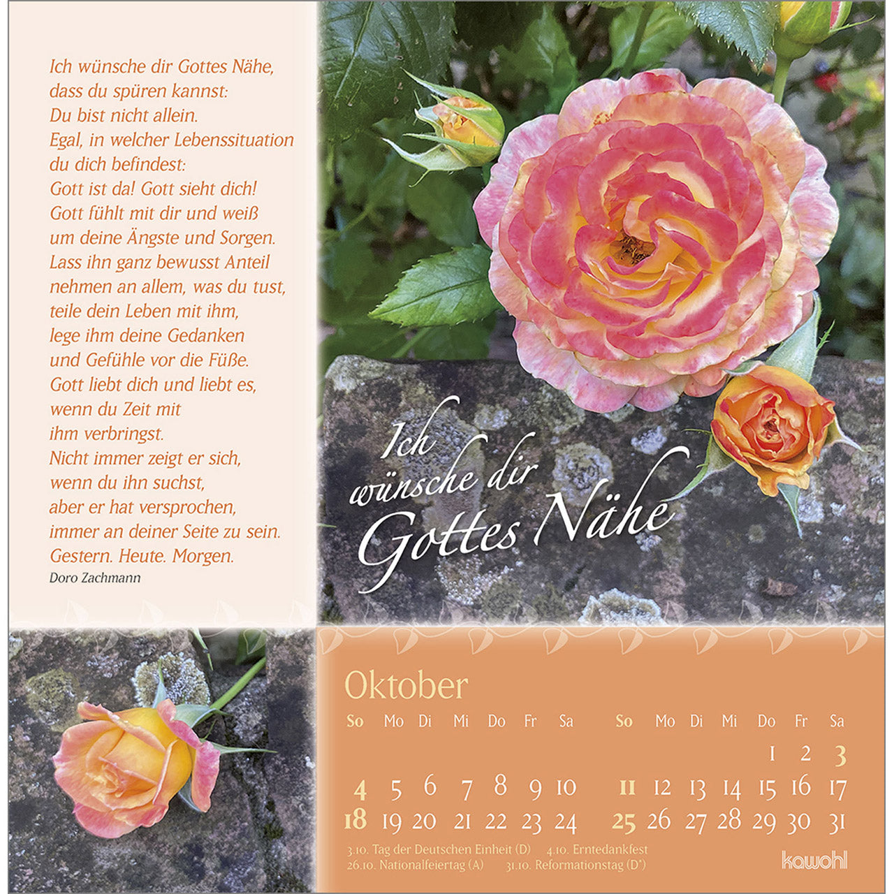 Verschenken Sie Schönheit und Blütenpracht aus Gottes wunderbarem Garten. Wohltuende, lebensnahe Wünsche von Doro Zachmann und verträumte Poesie streicheln die Seele und machen diesen Kalender zu einem Rosengruß für ein ganzes Jahr.
