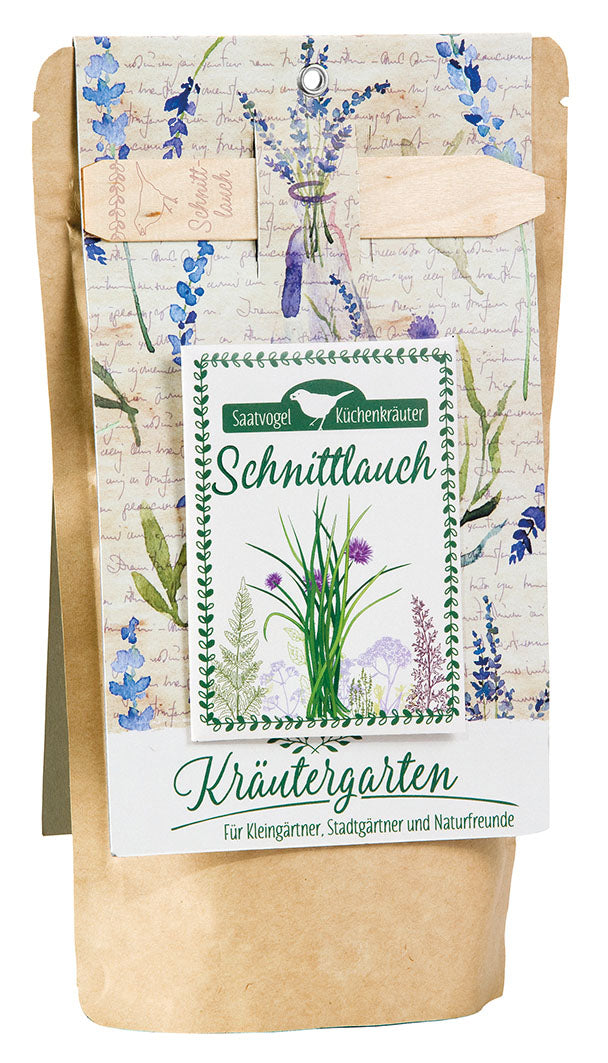 Erde, Saatgut und Holzpflanzstäbchen in wasserfester Tüte
