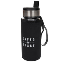 Trinkflasche aus Glas mit schwarzer Thermo-Manschette.