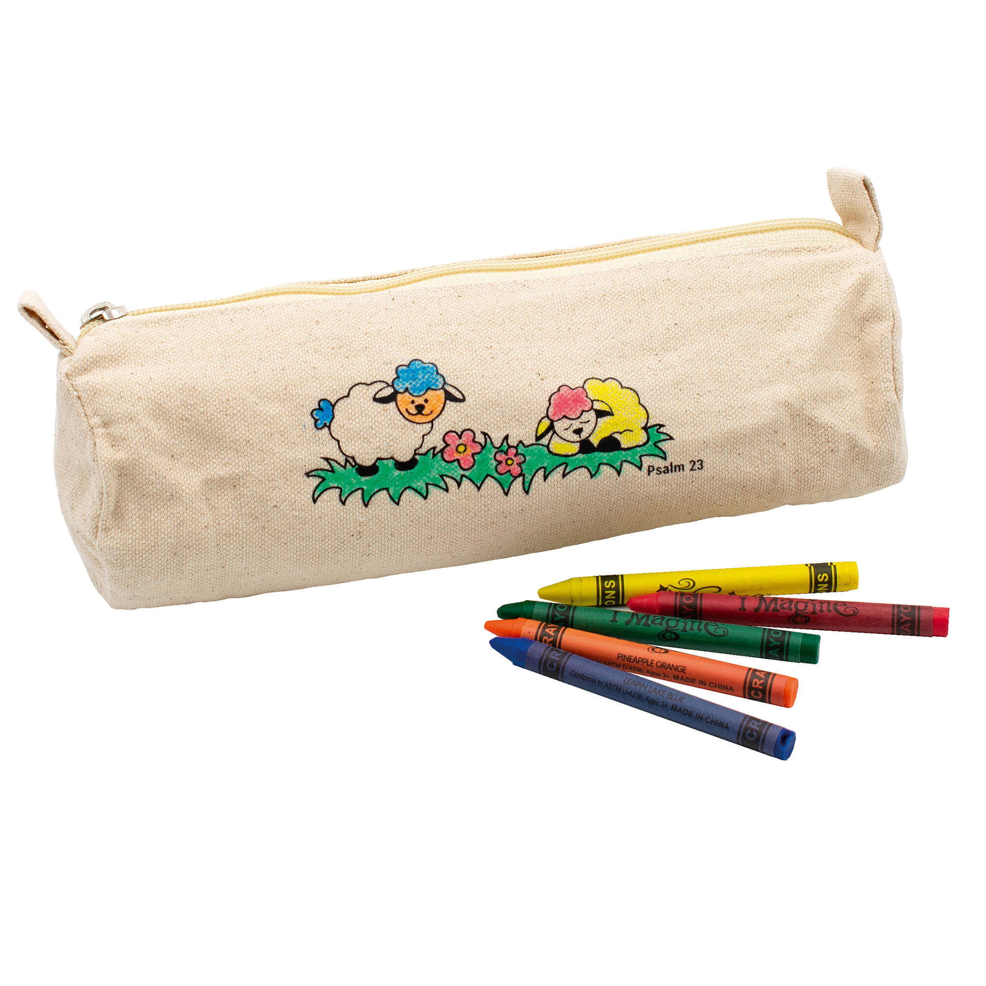 Bedruckt ist das Mäppchen mit zwei niedlichen Schäfchen und dem Text "Psalm 23". Das süße Motiv kann nach Belieben ausgemalt werden und macht damit jedes Mäppchen zu einem individuellen Unikat.