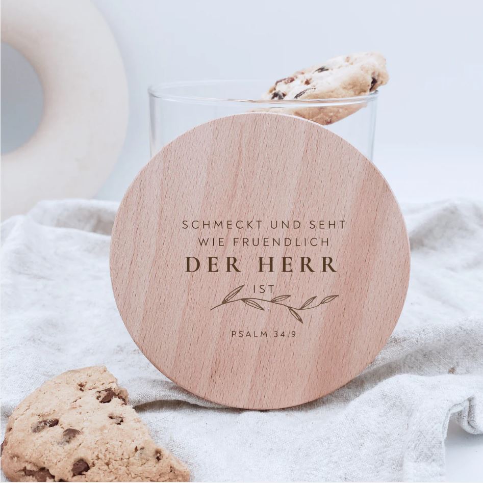 Unser hochwertiges Glas mit spülmaschinenfester Qualität und einem massiven Holzdeckel aus warmer Buche bringt nicht nur Ordnung in den Alltag, sondern auch geistliche Tiefe. Die feine Gravur "Schmeckt und seht, wie freundlich der Herr ist" macht es zu einem besonderen Geschenk voller Ermutigung, Liebe und Segen - ideal zur Hochzeit, Taufe oder als liebevolle Aufmerksamkeit für Menschen, die einem am Herzen liegen.