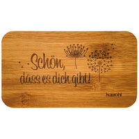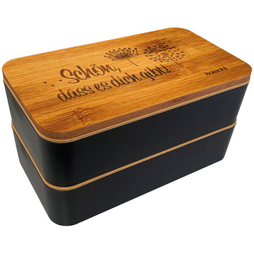 Mit dieser Lunchbox der Extra-Klasse haben Sie alles für die Mahlzeit unterwegs dabei. Sie besteht aus zwei separaten Dosen mit jeweils einem Deckel. Zusätzlich gibt es einen variablen Trenneinsatz sowie Messer, Gabel und Löffel, die zwischen den Etagen verstaut werden. Obenauf liegt noch ein Bambus-Schneidbrett mit dekorativem und ermutigendem Design. Das Schneidebrett ist ein Naturprodukt, jede Maserung ist anders und verleiht so jeder Box ihren individuellen Charme.