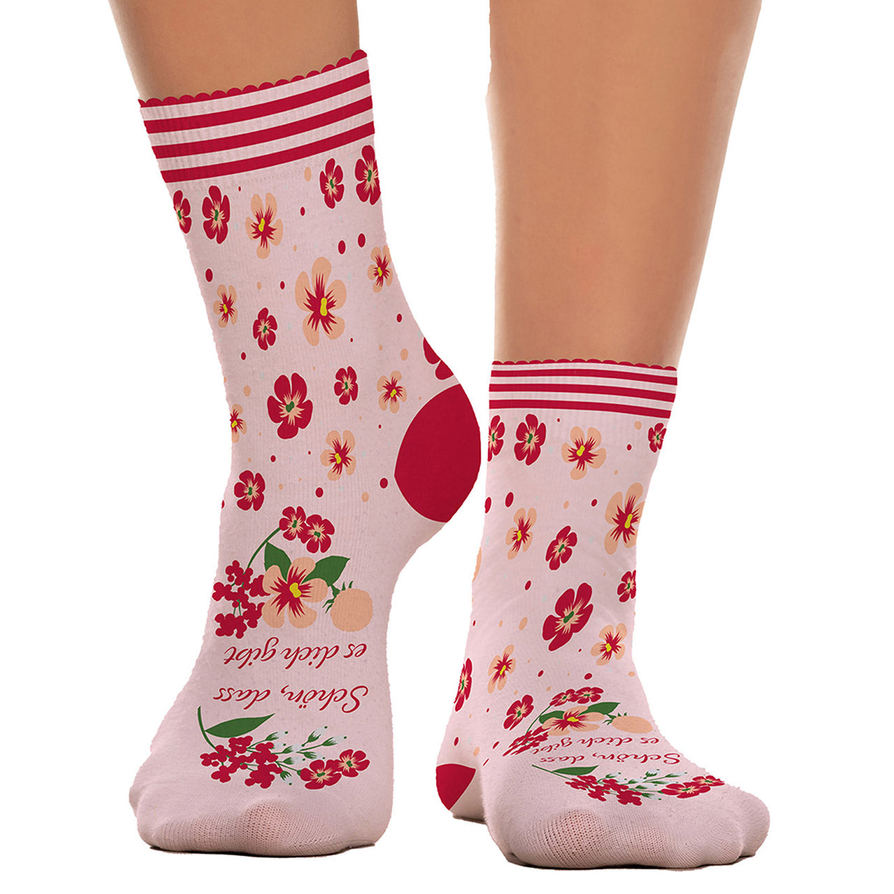 Gemütliche, farbenfrohe Socken mit wertschätzenden Worten und schönem Blümchen-Motiv.
