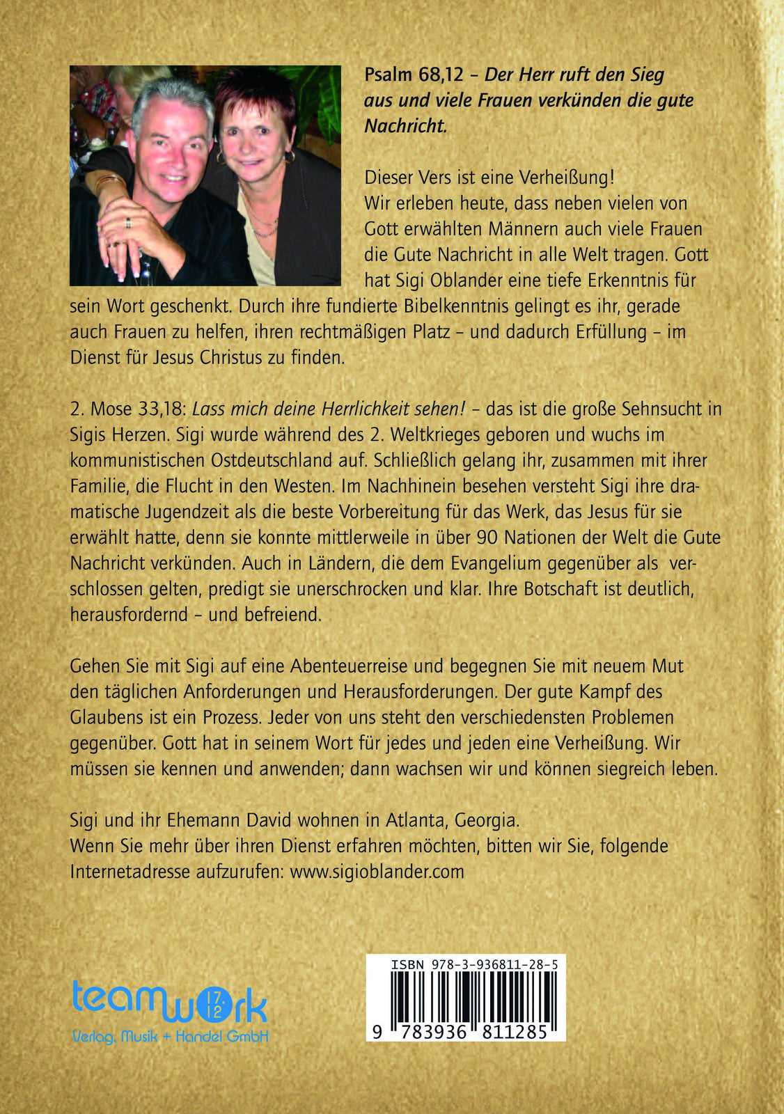 Lass mich deine Herrlichkeit sehen! - das ist die große Sehnsucht in Sigis Herzen. Sigi will uns durch diese ungewöhnliche Andachtsbuch auf eine Abenteuerreise mitnehmen, damit wir den täglichen Herausforderungen mit neuem Mut begegnen können. Sie weiß, dass der gute Kampf des Glaubens ein Prozess ist. Jeder von uns steht den verschiedensten Problemen gegenüber, doch in Gottes Wort finden wir immer die entsprechende Verheißung. Wir müssen sie jedoch kennen und anwenden, dann wachsen wir und können siegreich leben.