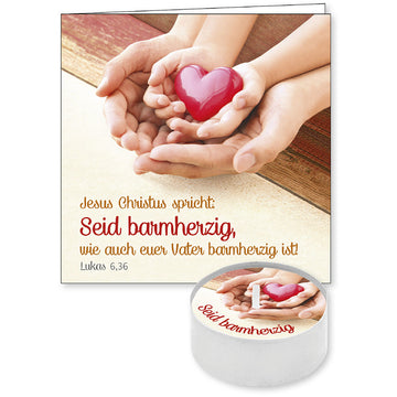 Text auf dem Teelicht: Seid barmherzig