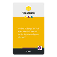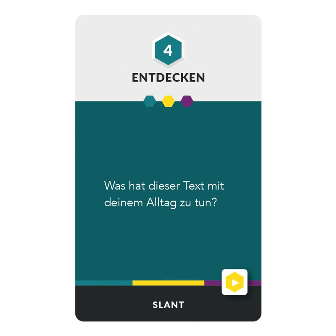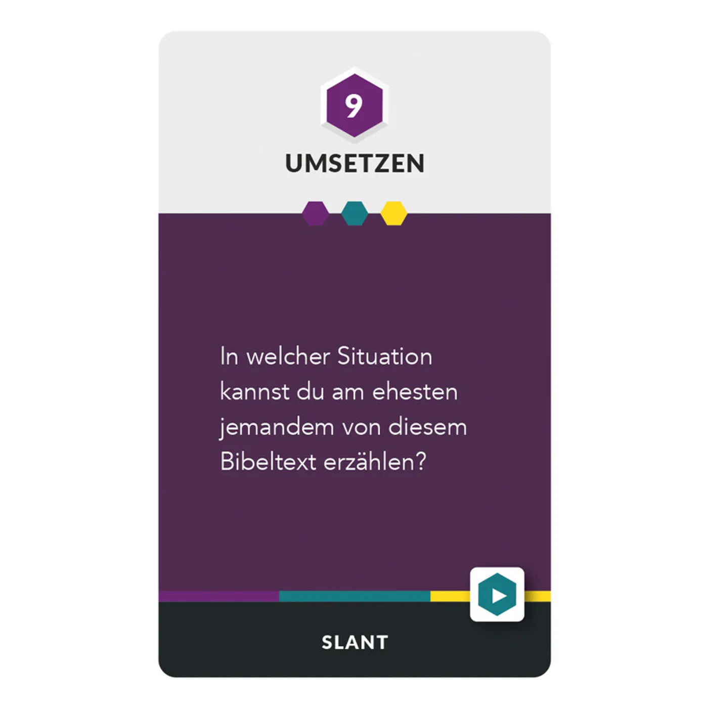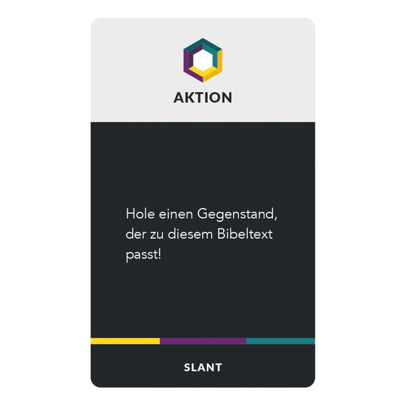 Dabei kann Slant entweder als Spiel gespielt werden oder man benutzt die Fragen (und Aktionen) als eine Art Gesprächshilfe, um gemeinsam in den Bibeltext einzutauchen.