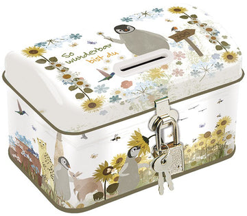 Blechspardose mit Schloss. Liebevoll und witzig gestaltet von Lutz Mauder.