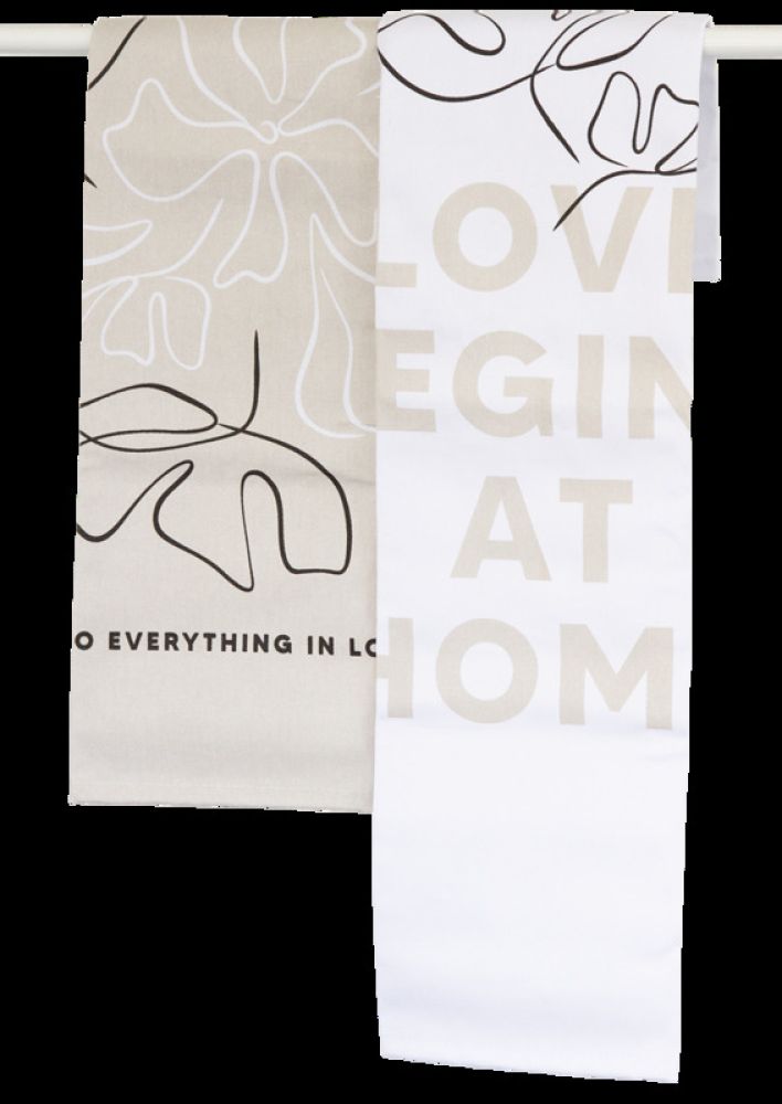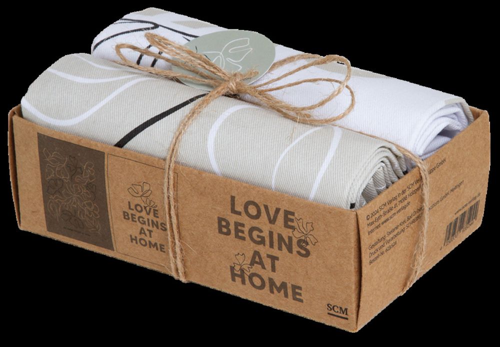 Die Geschirrtücher haben nicht nur ein tolles Design, sie setzen ein Statement in jeder Küche. Die Aufdrucke "Love begins at home" und "Do everything in love" machen das Set auch zu einem wunderbaren Hochzeitsgeschenk. Die Tücher sind in einem dekorativen Karton mit Kordel verpackt. Sie sind aus 100% Baumwolle und jeweils ca. 40 x 60 cm groß.