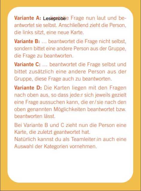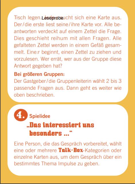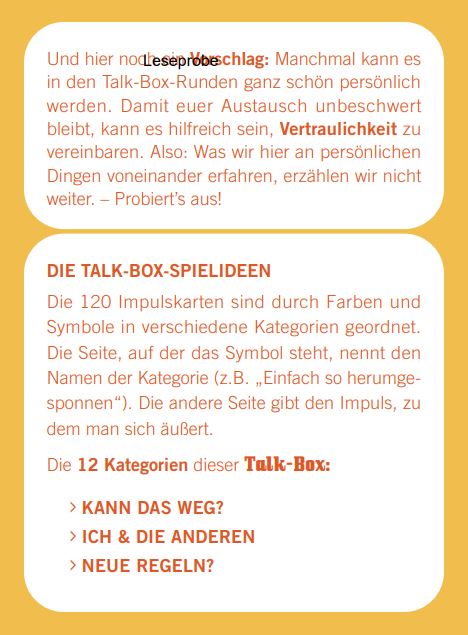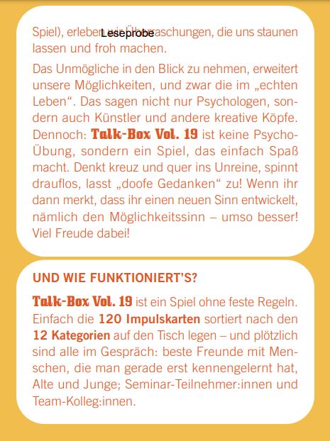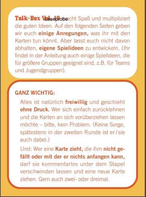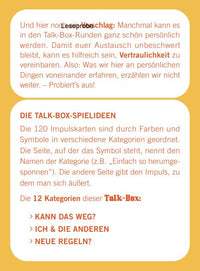 Die 120 Impulskarten laden dazu ein, die Fantasie spielen zu lassen - zum Beispiel beim Spieleabend im Freundeskreis, als Paar oder im Familienurlaub. Mit überraschenden Erkenntnissen für alle. Auch für Gemeindearbeit, Schule und Freizeitgruppen bietet diese Talk-Box spannende Einsatzmöglichkeiten. Was wäre, wenn Sie, du und ihr es einfach mal ausprobiert?
