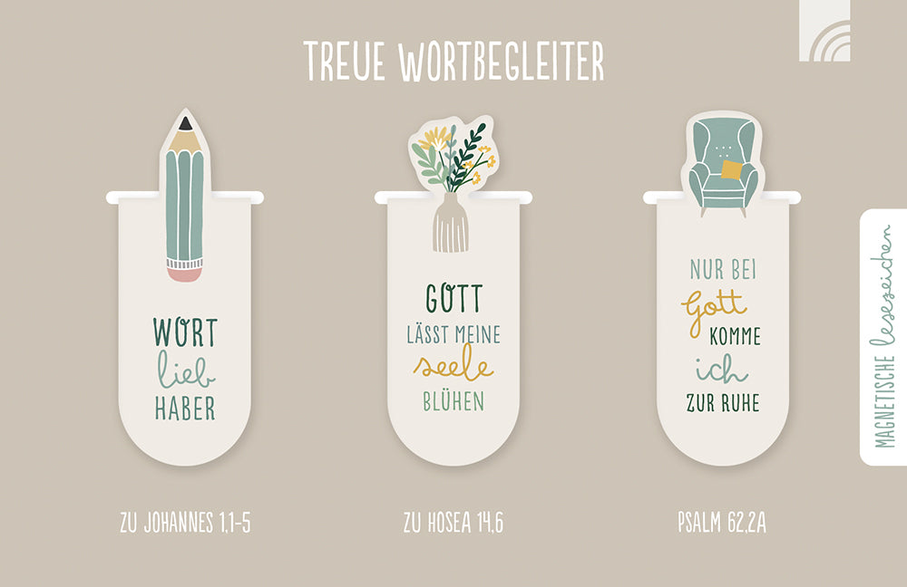 Kleine Mutmacher sollen die neuen Magnetlesezeichen sein. Leseliebhabern wird damit keine Seite mehr verloren gehen, weil zum Beispiel das Lesezeichen herausgerutscht ist. Die liebevoll gestalteten, handgezeichneten Motive stammen von Grafikerin Annika Mengel und sprechen in verschiedenen Lebenslagen an. Die kleinen Mutmacher und treuen Wortbegleiter bieten mit berührenden Bibelzitaten und ansprechenden Zusprüchen eine besondere Lesezeit.