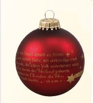 Der Vers Lk 2,10-11 aus der Weihnachtsgeschichte ist rundum auf die bordeauxfarbene Christbaumkugel gedruckt.